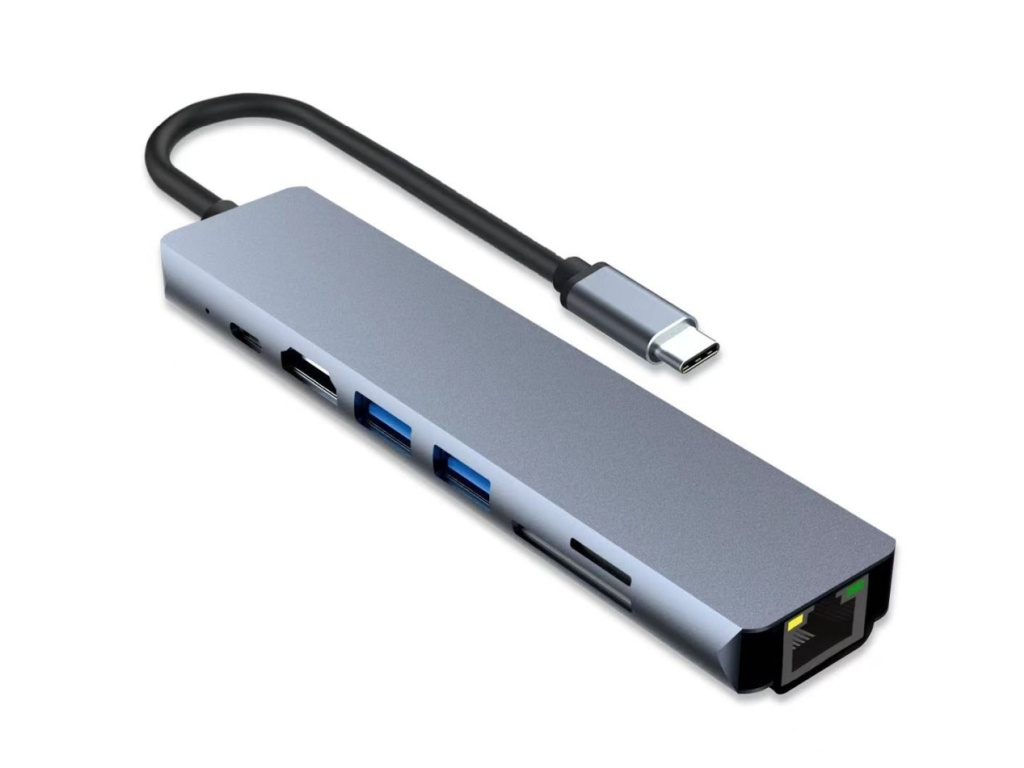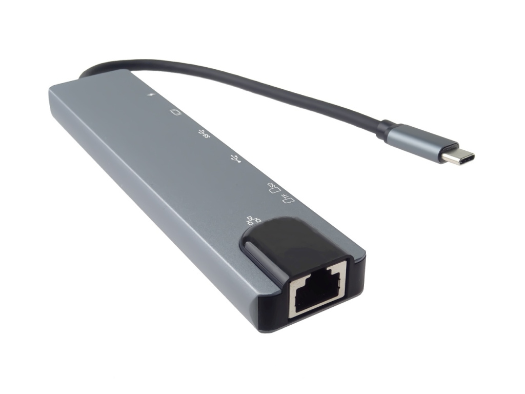 Víceportový adaptér USB-C obsahuje vysokorychlostní port Ethernet / RJ-45, nabíjecí port 87 W PD, porty USB 3.0 a USB2.0, video výstup 4K HDMI + čtečka karet Micro SD a TF 2.0