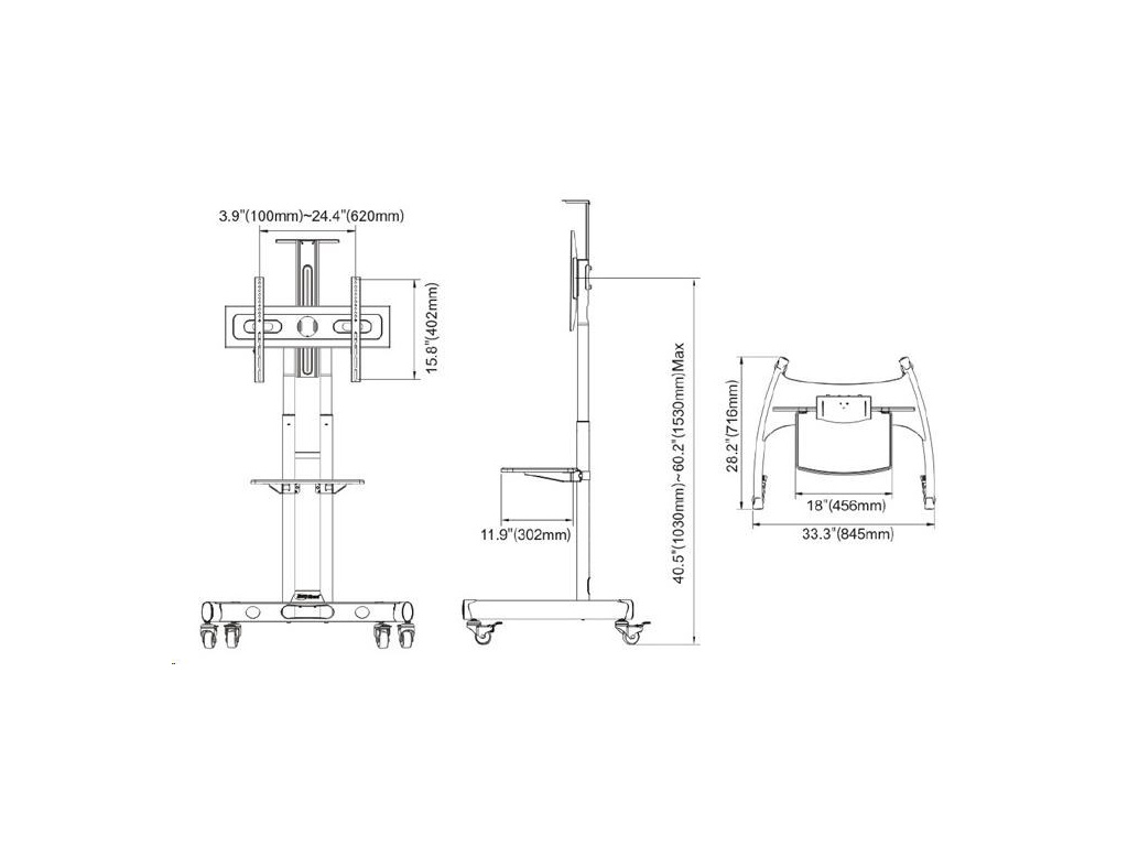 Technické údaje: maximální zatížení 45,3kg na Tv 32" až 65" VESA standart 100x100 až 600x400 min. výška stojanu 1050mm max. výška stojanu 1500mm nastavitelná výška obrazovky funkce uzamčení televizoru systém vedení kabeláže police na příslušenství (odnímatelná, součást balení) polička na kameru, webkameru nebo projektor (odnímatelná, součást balení) pojezdová kolečka s brzdou dokonalá stabilita profesionální konstrukce velmi pěkný design záruka 5 letEAN: 387714