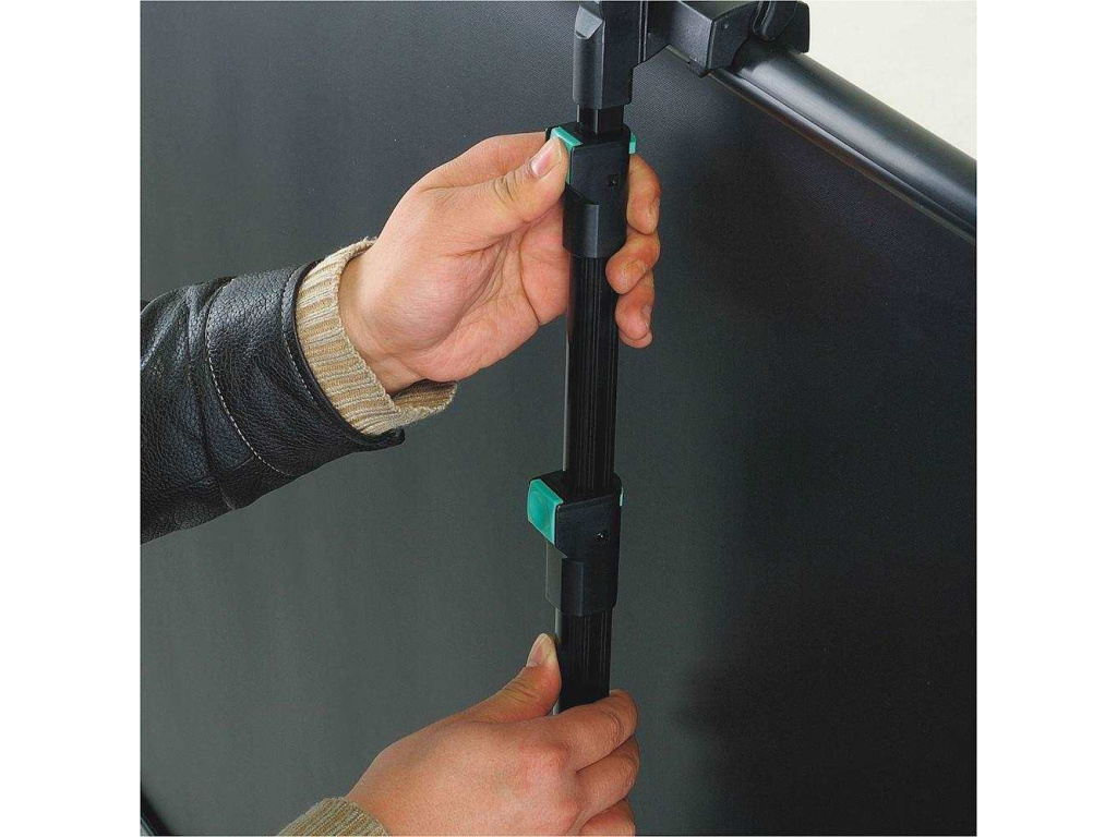 Inovativní design a bezpečnostní funkce, které bezpečně uzamknou obrazovku uvnitř pouzdra během přepravy. Po zvednutí opěrné tyče se pouzdro automaticky odemkne, což umožňuje vytažení obrazovky za rukojeť. Po zasunutí obrazovky se pouzdro automaticky uzamkne. Nosná tyč je také vybavena jednosměrným patentovaným zámkem, který umožňuje úplné zajištění a snadné nastavení opěrky zad. To vám umožní plynule upravit výšku obrazovky. Rukojeť neslouží pouze ke zvedání a vytahování zástěny z pouzdra, ale také k jejímu připevnění k nosné tyči, aby se zástěna nespadla nebo se posunula.