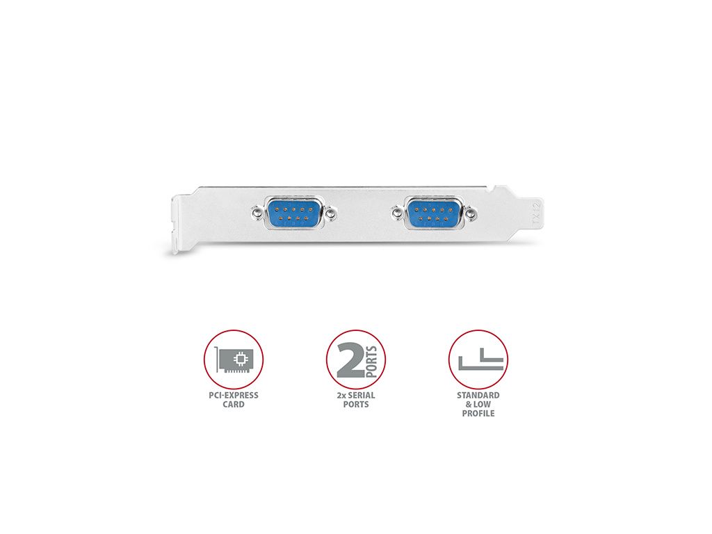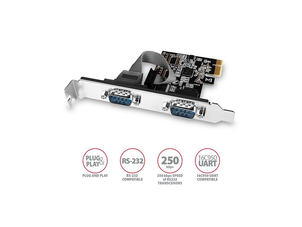 Výstup: • 2x sériový RS-232 port s DB9 male konektory, porty umístěny na záslepce karty. • Garantovaný datový tok použitých RS232 budičů až 250 kBd. • Kompatibilní s 16C550 / Extended 16C550 / 16C950 UART.