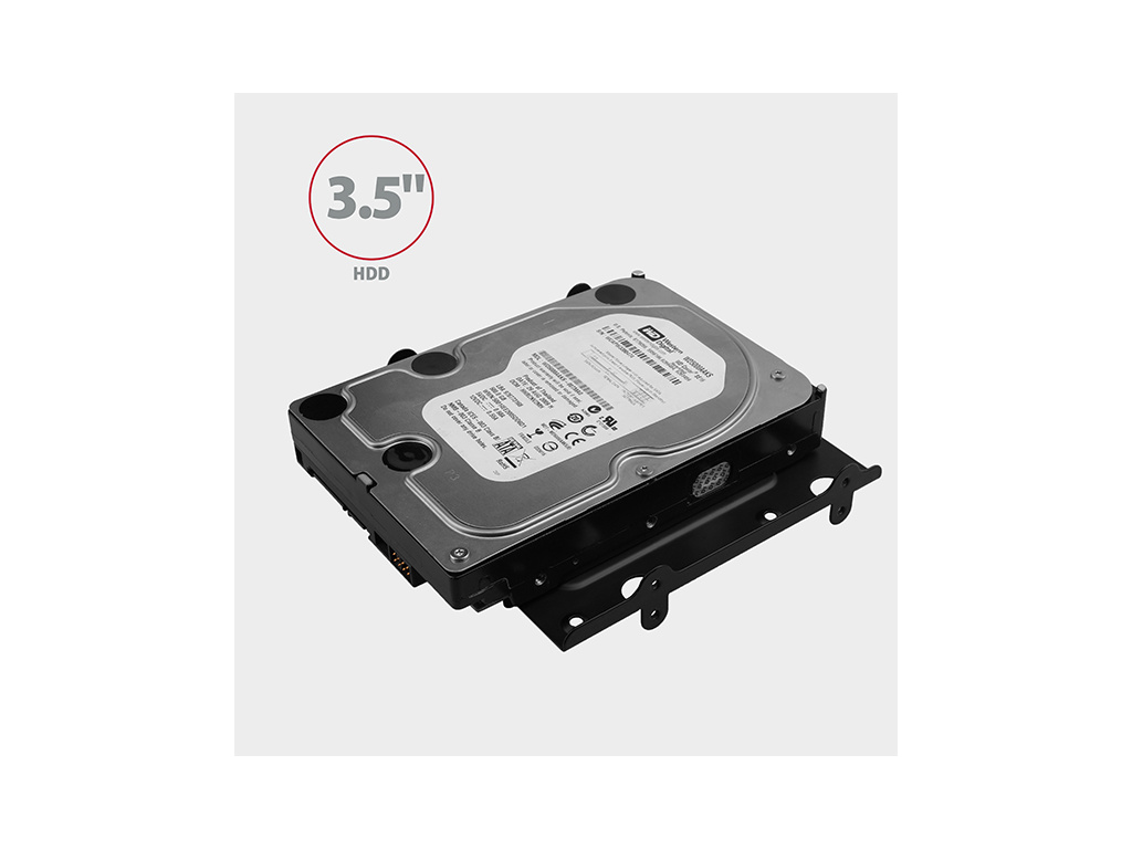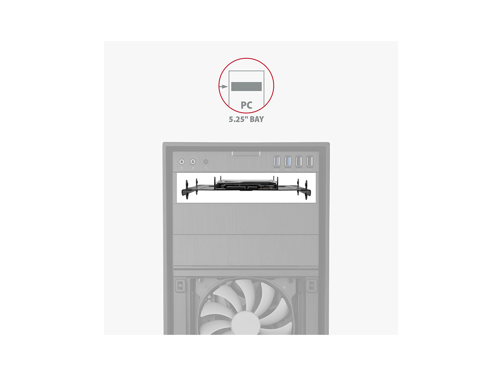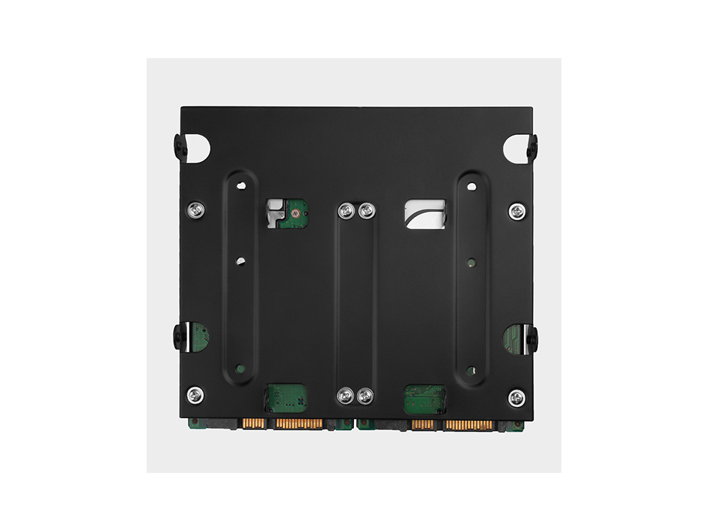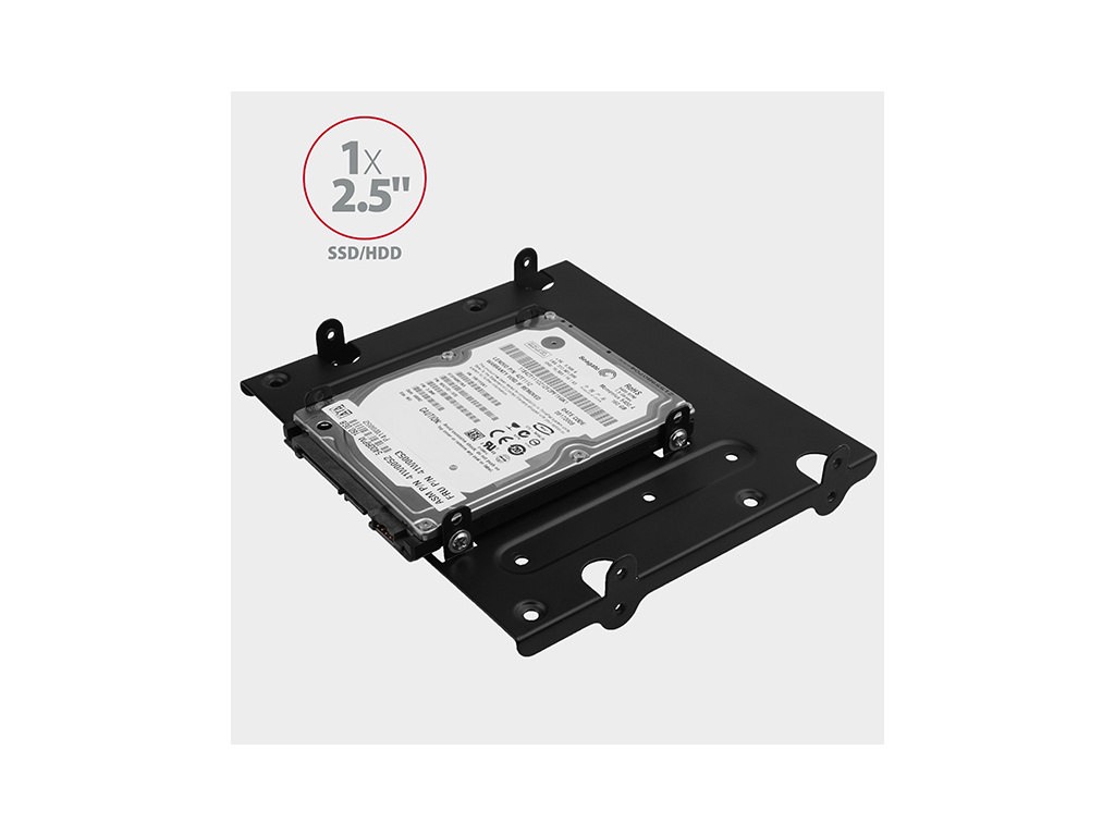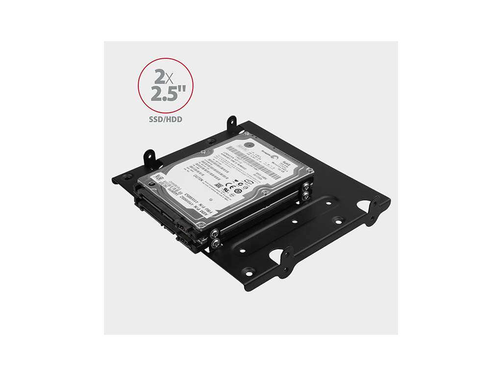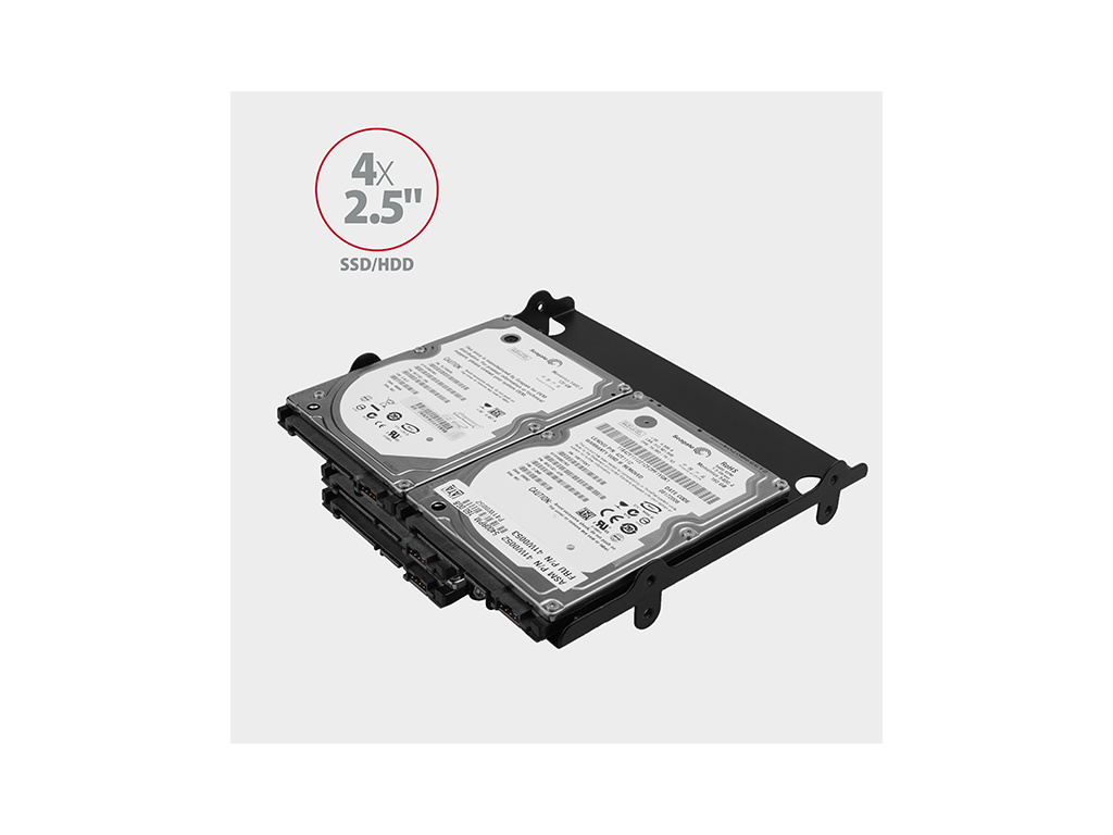 až čtyř 2.5'' HDD nebo SSD disků nebo dvou 2.5'' disků a jednoho 3.5'' disku do 5.25'' pozice PC skříně. Tato redukce chytře vyřeší problém s umístěním 2.5'' nebo 3.5'' disků v různých typech počítačových skříní. V horní pozici lze použít standardní 2.5'' SSD disky 7 mm i pevné disky 9.5 mm. Spodní pozice je určena pro standardní 3.5'' pevný disk alternativně pro 2.5'' SSD/HDD bez omezení výšky disku. Přesné otvory a dodávané šroubky zajistí snadnou a bezproblémovou montáž rámečku do počítačové skříně. Kovová konstrukce rámečku napomáhá