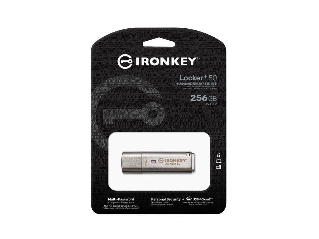 USB flash disky Kingston IronKey Locker+ 50 poskytují zabezpečení na spotřebitelské úrovni s hardwarovým šifrováním AES v režimu XTS včetně zabezpečení proti BadUSB s digitálně podepsaným firmwarem a zabezpečení proti útokům hrubou silou. Řada LP50 je také kompatibilní s TAA. Řada LP50 nyní podporuje volbu více hesel (správce a uživatele) s režimy složitého přístupového hesla nebo fráze. Režim složitého hesla umožňuje tvorbu hesel v délce 6–16 znaků s využitím 3 ze 4 znakových sad. Režim přístupového hesla fráze umožňuje využití číselného kódu PIN, věty, seznamu slov nebo zapamatovatelného citátu v délce 10 až 64 znaků. Správce může povolit heslo uživatele nebo resetovat heslo uživatele pro obnovení přístupu k datům. Pro usnadnění zadávání hesla lze aktivovat symbol „oka“, který odkryje zadávané heslo, čímž se omezí překlepy vedoucí k neúspěšným pokusům o přihlášení. Ochrana proti útokům hrubou silou zablokuje uživatele po 10 neplatných heslech zadaných v řadě a šifrovaně vymaže disk, pokud je heslo správce zadáno nesprávně 10× za sebou. Vestavěná virtuální klávesnice navíc chrání hesla před keyloggery nebo screenloggery. USB flash disk Locker+ 50 je navržen pro maximální komfort s malým kovovým pouzdrem a vestavěným očkem pro kroužek na klíče, abyste si mohli vzít data kamkoli. Řada LP50 nabízí rovněž volitelné zálohování USBtoCloud (poskytované ClevX®) pro přístup k datům na disku z vašeho osobního cloudového úložiště prostřednictvím služeb Google Drive™, OneDrive (Microsoft®), Amazon Cloud Drive, Dropbox™ a Box. USB flash disky LP50 je schopen každý snadno nastavit a používat – není nutné instalovat žádnou aplikaci, veškerý potřebný software a zabezpečení jsou již přítomny na disku. Disky pracují v operačních systémech Windows® i macOS®, takže mohou uživatelé přistupovat k datům z více systémů.Šifrování: Hardwarové XTS-AES pro ochranu dat s automatickým USBtoCloud® zálohováním