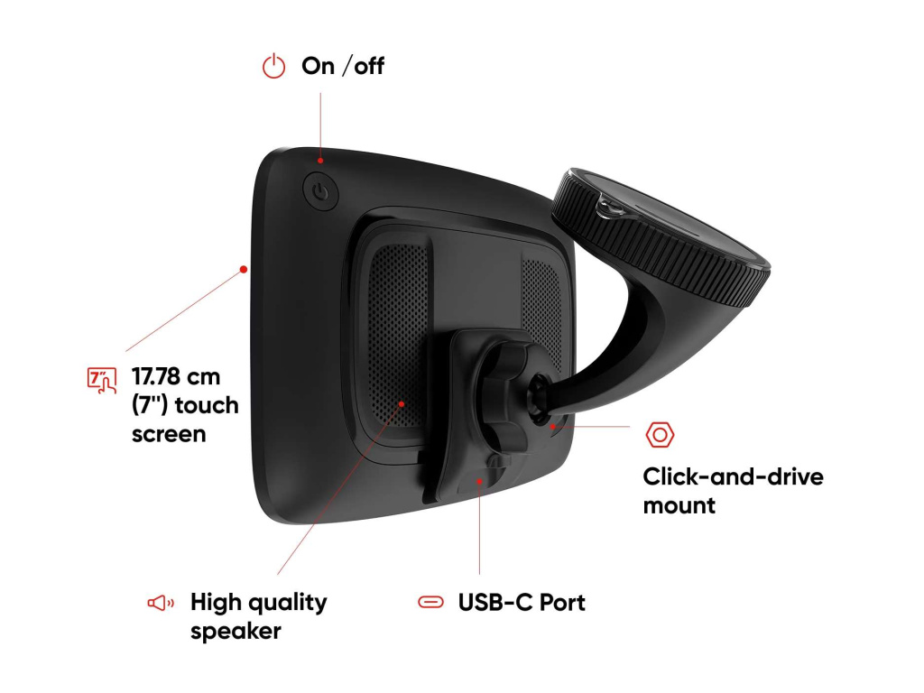 Na 7" dotykové obrazovce si můžete prohlédnout svou trasu ve vysokých detailech. A díky ovládání pomocí hlasových příkazů můžete zařízení GO Camper Max ovládat, aniž byste museli sundat ruce z volantu. Snadno použitelný držák Click-and-Drive navíc drží navigační zařízení bezpečně na místě.