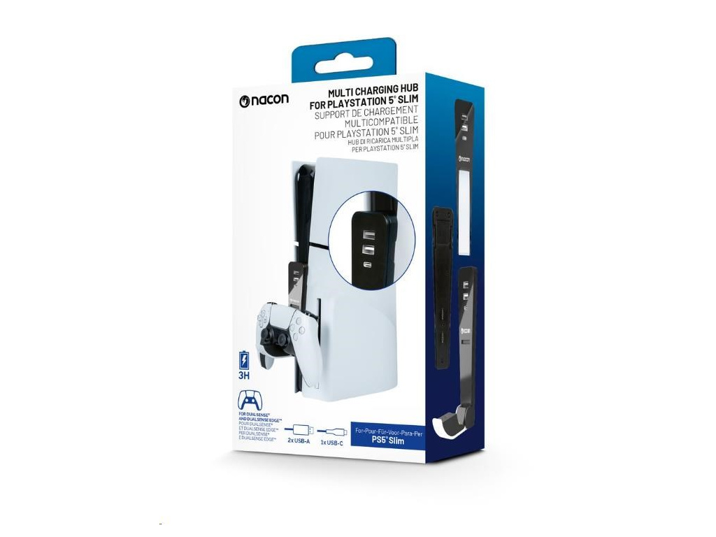 Nabíjejte svůj bezdrátový herní ovladač DualSense nebo DualSense Edge s pomocí tohoto nabíjecího doku od společnosti Nacon. Dok se připojuje k USB-C portům na přední straně konzole PlayStation 5 Slim a dokáže plně nabít ovladač během tří hodin. Poté, co si nabitý ovladač vezmete z doku zpět, můžete dok přiklopit ke konzoli, abyste o něj nechtěně nezavadili. Dok navíc nabízí dva porty USB-A a jeden port USB-C, ke kterým můžete v případě potřeby připojit další zařízení.