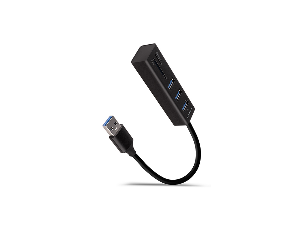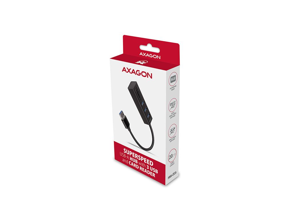 AXAGON HMA-CR3A, USB 3.2 Gen 1 hub, porty 3x USB-A + čtečka karet SD/microSD, kovový, kabel USB-A 20, HMA-CR3A