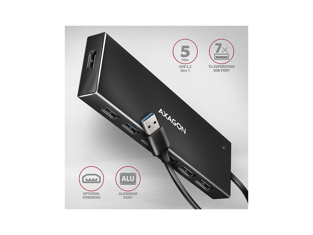 AXAGON HUE-F7A, 7x USB 3.2 Gen 1 ALU FLAT CHARGING hub, micro USB napájecí konektor, kabel USB-A 1m, HUE-F7A