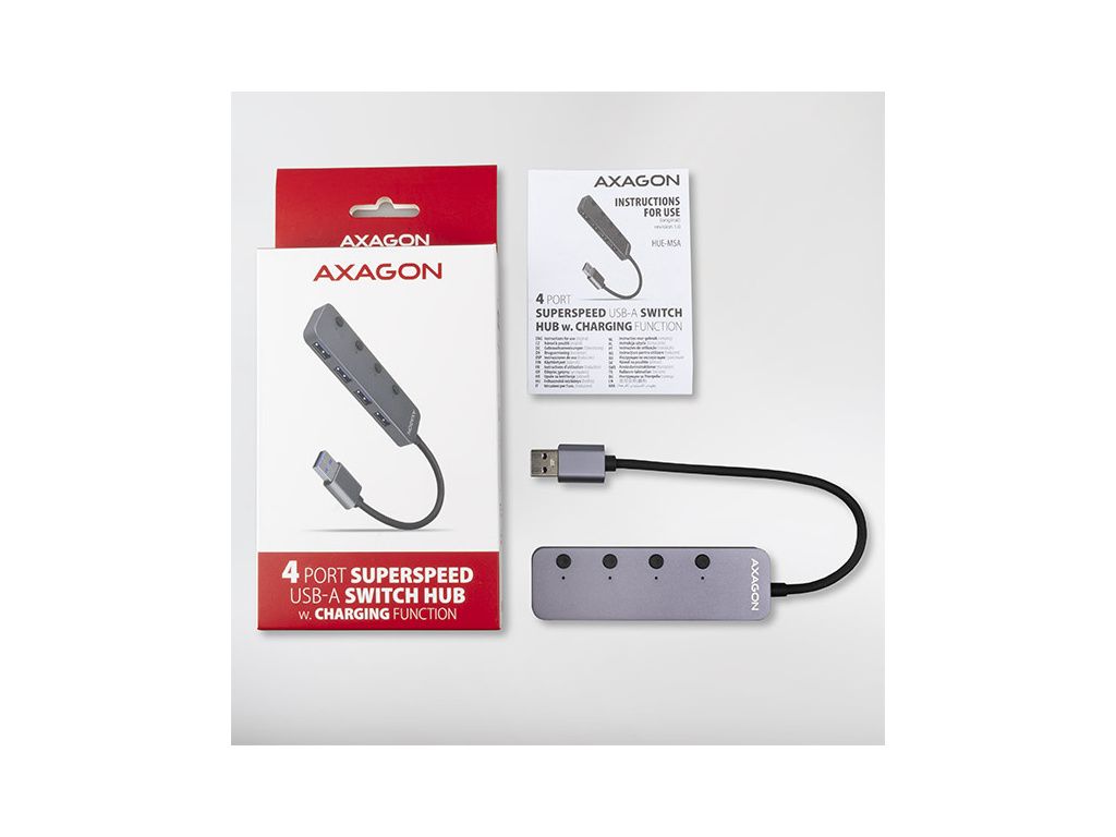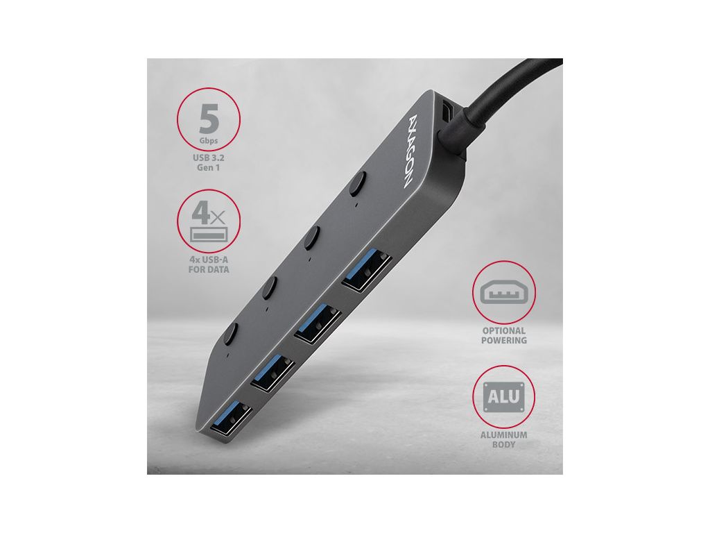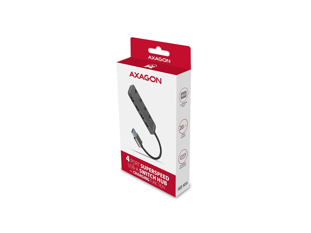 AXAGON HUE-MSA, 4x USB 3.2 Gen 1 SWITCH hub, kovový, micro USB nap. konektor, kabel USB-A 20cm, HUE-MSA