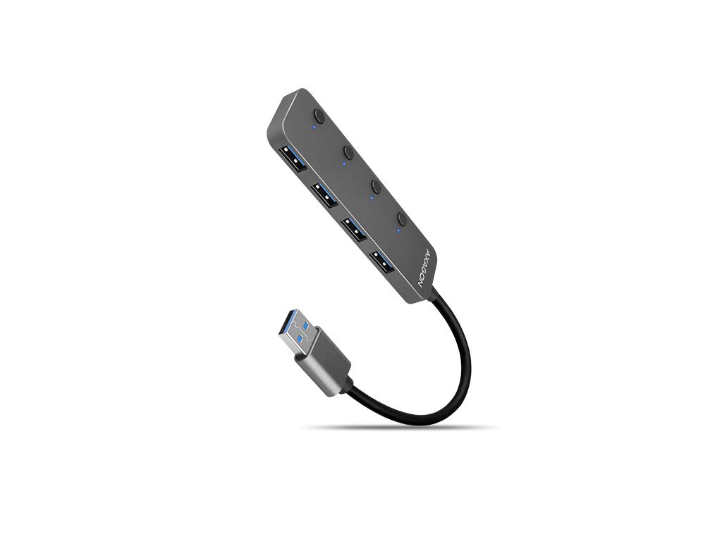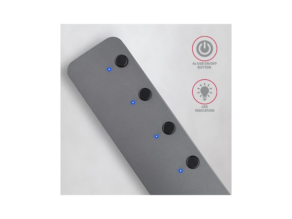 vypnout / zapnout pomocí tlačítka. Lze tak snadno odpojovat nepotřebná zařízení bez nutnosti jejich odpojování z USB hubu. Každý USB-A port má modrou LED indikaci zapnutí / vypnutí portu. Po zapojení hubu všechny LED svítí = porty jsou zapnuté, LED nesvítí = port je vypnutý.