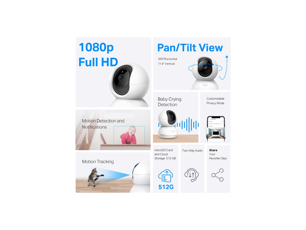 Tapo C200C je vybaven videem ve vysokém rozlišení 1080p, které uživatelům poskytuje jasné a detailní záběry. Až 9násobný digitální zoom umožňuje uživatelům vidět ostřejší zobrazení zájmových oblastí.