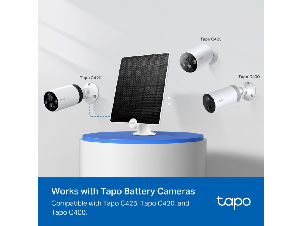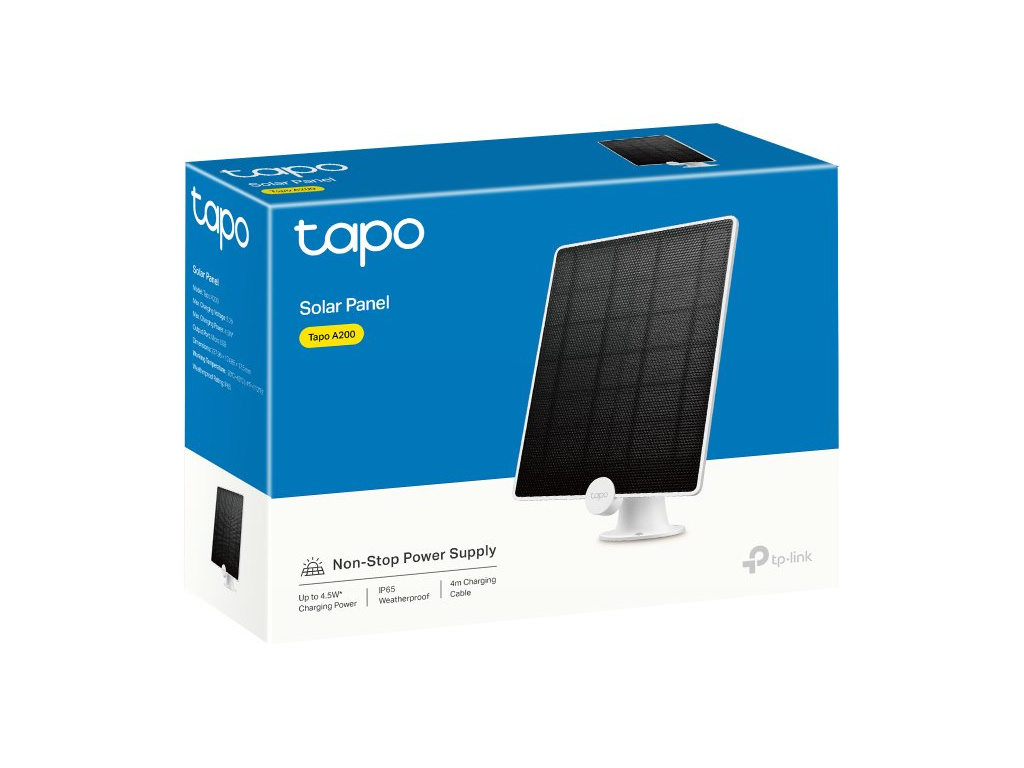 TP-Link Tapo A200Solární panel o výkonu 4,5 W zajišťuje stálé napájení pro bateriové kamery TP-Link Tapo. Je ideální pro oblastí, kde je nasazení sítě a napájení náročné, a navíc odstraňuje potíže s kabeláží a snižuje investiční náklady. Díky 4 m dlouhému nabíjecímu kabelu nabízí flexibilní instalaci. Součástí balení je 360° držák, se kterým lze panel nastavit do ideálního úhlu pro zachycení dostatečného množství světla.
