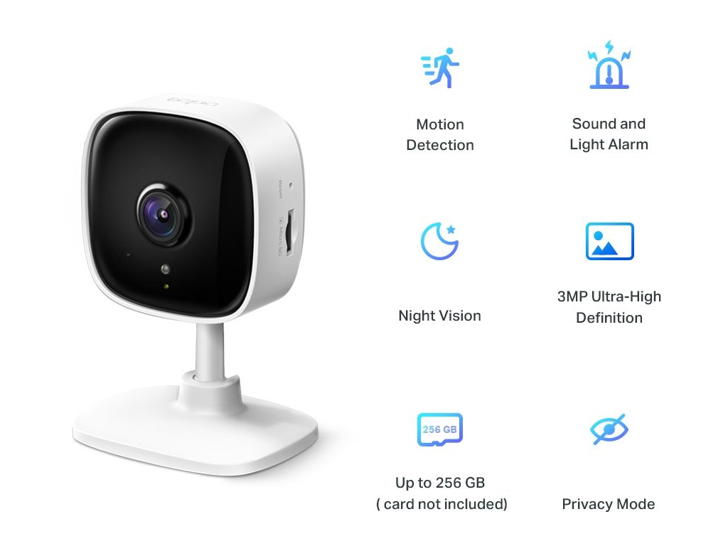 Wi-Fi kamera pro zabezpečení domácnosti Video s rozlišením UHD – zaznamenejte každý okamžik v ultra vysokém 3MPx rozlišení. Pokročilé noční vidění – nabízí viditelnost až do vzdálenosti 10 m. Detekce pohybu a upozornění – upozorní vás, pokud kamera zaznamená pohyb. Zvukový a světelný alarm – aktivace světelných a zvukových efektů na odrazení nevítaných návštěvníků. Obousměrný zvuk – umožňuje komunikaci pomocí integrovaného mikrofonu a reproduktoru. Bezpečné úložiště – místní úložiště až 256 GB na kartě mikro SD, což odpovídá 512 hodinám (21 dnům) záznamu (při laboratorních podmínkách). Snadné nastavení a správa – ovládejte vše potřebné pomocí aplikace Tapo. Detekce pohybu Dostávejte upozornění, kdykoliv kamera detekuje pohyb, a prohlédněte si videoklip pro bližší prozkoumání situace. Můžete rovněž nastavit zóny detekce pohybu, a přizpůsobit tak kameru podle svých potřeb, aby zaznamenávala pouze situace ve zvolené oblasti. Noční vidění Nevzbuďte děti bouchnutím dveří, když je chcete zkontrolovat. Sledujte je na svém smartphonu pomocí nočního vidění s dosahem 10 metrů. Vy budete mít klid v duši a děti budou nerušeně spát. Video ve vysokém rozlišení 3MPx video v rozlišení UHD poskytuje jasnější a ostřejší obraz díky vyššímu počtu pixelů. Usnadňuje tak identifikaci a rozpoznávání na větší vzdálenost. Obousměrný zvuk Komunikujte s milovanou osobou pomocí integrovaného mikrofonu a reproduktoru. Ochrana vašeho soukromí Režim soukromí a místní paměťová karta zajistí ochranu vašeho soukromí. Alarm Při detekování pohybu kamera nejenže odešle uživateli upozornění, ale současně zapne světla a spustí zvukový alarm. Sdílení nezapomenutelných okamžiků Uložte si nezapomenutelné okamžiky a sdílejte je se svými milovanými. Kamery Tapo vám vždy pomohou zaznamenat každou památnou chvilku. To nejdůležitější na několik málo klepnutí S bezplatnou aplikací Tapo budete mít vše potřebné na dosah ruky. Ukládání videí a přehrávání starších záznamů Vyberte konkrétní kameru a vyhledejte požadovaný obsah podle data. Plán pravidelného záznamu videí Kamera automaticky zaznamená videa podle vašeho časového plánu bez ohledu na to, zda detekuje pohyb. Prohlížení několika zobrazení současně NETWORK Security 128 Bit AES Encryption with SSL/TLS Wireless Rate 11 Mbps (802.11 b) 54 Mbps (802.11 g) 72.2Mbps (802.11n) Frequency 2.4 GHz Wireless Security WPA, WPA2-PSK ACTIVITY NOTIFICATIONS Input Trigger Motion Detection Output Notification Push Notification VIDEO Video Compression H.264 Video Streaming 3MP SYSTEM Regulatory Certification CE, NCC System Requirements iOS 9+, Android 4.4+ ENVIRONMENT Operating Temperature 0-40 °C (32-104 °F) Storage Temperature -40-70 °C (-40-158 °F) Operating Humidity 10-90% RH Non-Condensing Storage Humidity 5-90% RH Non-Condensing PACKAGE CONTENTS Package Contents Tapo C110 DC Power Adapter Quick Start Guide Mounting Screws Mounting Template HARDWARE Button Reset Button Indicator LED System LED Adapter Input 100-240V, AC, 50/60 Hz, 0.3 A Adapter Output 9.0 V / 0.6 A Dimensions (W x D x H) 2.7 x 2.1 x 3.9 in (67.6 x 54.8 x 98.9 mm) CAMERA Image Sensor 1/2.8’’ Resolution 3MP(2304 x 1296) Lens F/NO: 2.0, Focal Length: 3.3 mm Night Vision 850 nm IR LED (up to 30 ft) AUDIO Audio Communication Two-Way Audio Audio Input & Output: Microphone and SpeakerEAN: 4897098682760
