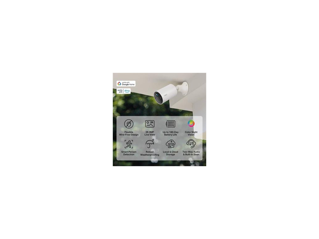 Inteligentní bezdrátová vnitřní/venkovní bezpečnostní kamera SPEC: 2K (2304x1296), 2,4 GHz, 6400mAh dobíjecí lithium-iontová baterie Užijte si naprostou svobodu díky bezdrátovému designu C410 napájeného baterií. Jeho všestrannost eliminuje omezení zásuvek a umožňuje ultraflexibilní vnitřní a venkovní bezpečnostní monitorování odkudkoli. Komunikujte s hosty nebo přepravci na dálku prostřednictvím čistého, obousměrného zvuku, který nabízí pohodlí, i když jste pryč. Tapo C410, kompatibilní s Alexa a Google Assistant, vám umožňuje kontrolovat váš dvorek pomocí hlasových příkazů. I během bouřky, výpadku proudu nebo přerušení Wi-Fi Tapo C410 pokračuje v nahrávání a zajišťuje konzistentní zabezpečení. Klíčové vlastnosti Bezdrátová instalace, instalace téměř kdekoli: Eliminuje potřebu zásuvek a umožňuje flexibilní umístění. Dodejte svému domovu zabezpečení, ať jste kdekoli a kdykoli. Vynikající obraz 2K 3MP: Zachyťte každý detail v křišťálově čistém rozlišení 2K s pokročilými algoritmy zajišťujícími perfektní expozici ve dne i v noci. Barevné noční vidění: Podívejte se na noc v živých barvách s objektivem s velkou světelností a vestavěnými reflektory účinnými až do vzdálenosti 30 stop (9 m). Prodloužená životnost baterie: Díky až 180 dnům zabezpečení na jedno nabití, Tapo C410 minimalizuje údržbu. Flexibilní možnosti úložiště: Vyberte si z místního úložiště microSD až do 512 GB nebo ze zabezpečené cloudové služby Tapo Care pro další klid. Inteligentní detekce osob: Získejte upozornění, když je detekována osoba, čímž se omezí falešná upozornění a zbytečná upozornění. Inteligentní telefonická upozornění: Přizpůsobte si zóny aktivity pro přesnou detekci pohybu a telefonická upozornění se zaměřením na to, na čem skutečně záleží. IP65 Odolnost vůči povětrnostním vlivům: Nabízí vynikající vodotěsný a prachotěsný výkon pro venkovní scénáře. Obsah balení Přístroj Držák USB adaptér USB adaptérový kabel 3x šrouby a kotvy Montážní šablona Rychlý návodEAN: 4895252503746