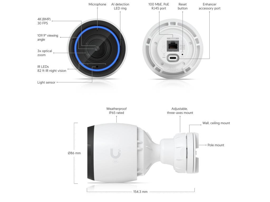 Ubiquiti G5 Professional Vnitřní/venkovní kamera 4K PoE s výjimečným obrazovým výkonem a objektivem s 3x optickým zoomem.