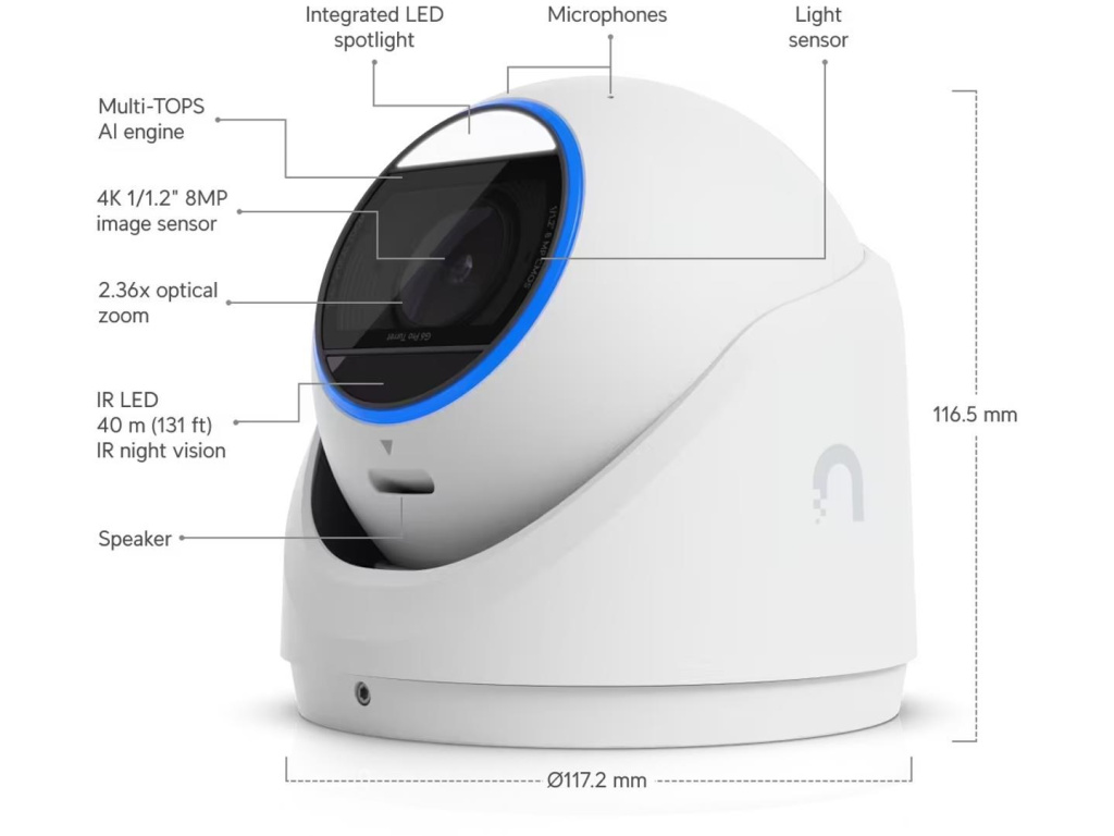 Popis produktu Ubiquiti UniFi IP turret hybrid kamera UVC-G6-Pro-Turret-W disponuje 8MP snímačem (3840 x 2160 px) při 30fps, variofokálním objektivem (5,85mm-13,8mm), kombinovaným IR/bílé světlo přísvitem pro noční vidění na vzdálenost až 40m, krytím IP66 a IK4 a vestavěnými mikrofony. Do sítě lze kameru připojit pomocí 1Gbit LAN s podporou napájení přes PoE+ s maximální spotřebou 15W. Klíčové vlastnosti • 8MP 30fps video (3840 x 2160 px) • Pokročilá AI detekce - odfiltrování falešných poplachů a spolehlivá detekce osob a vozidel • Hybridní Smart přísvit - IR/LED přísvit s dosahem 40m • Podporuje lokální záznam na microSD kartu nebo na NAS • Spravováno prostřednictvím UniFi Protect • IP66 kryt odolný proti povětrnostním vlivům • IK4 odolnost vůči vandalům • Napájení pomocí 802.3at 42.5-57V PoE+ Obsah balení • Zařízení • Šroubky, hmoždinky, nářadí • Držák na zeď/strop Technické parametry Kamera Zoom (optický):2,36x Typ objektivu:Varifokální - motorický Objektiv [mm]:5,85 až 13,8 (nastavitelný) Přísvit:Hybridní IR / bílé světlo Dosah přísvitu [m]:40 Pozorovací úhel [°]:45,5 až 113,8 Režim den/noc:Hybridní IR cut filtr / barevný Obrazový senzor ["]:1/1.2 Obraz Rozlišení:8MP Max. rozlišení [pixely]:3840 x 2160 (4K UHD) Konektory a rozhraní Slot na paměťové karty:microSD Audio:2 Mikrofony, Reproduktor Rychlost LAN:(1) 10/100/1000Mbps Napájení Napájení přes PoE:802.3at, 42 .. 57V DC Typ napájení:PoE Max. spotřeba energie [W]:15 Fyzické charakteristiky Stupeň krytí:IP66 Použití:Venkovní Antivandal (ochrana proti nárazu):IK4 Tlačítka:Reset Provozní teplota [°C]:-30 až 50 Hmotnost [g]:1200 Šířka [mm]:117 Výška [mm]:117 Hloubka [mm]:117 Barva:Bílá Obecné Kamerová řada:UniFi Protect Technologie a vymoženosti:Čtení SPZ, Face detection, Detekce vozidla, Multi-TOPS AI EngineEAN: 810177163251
