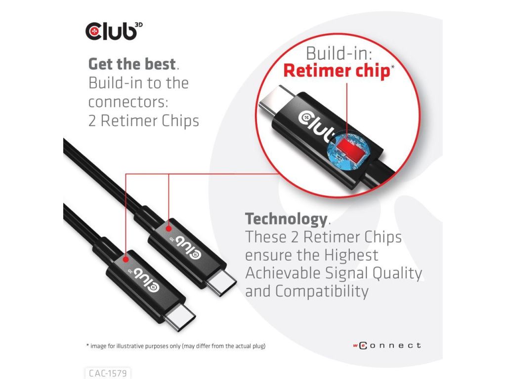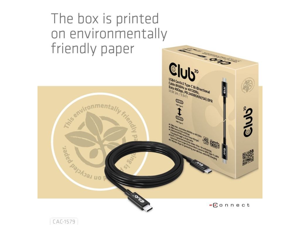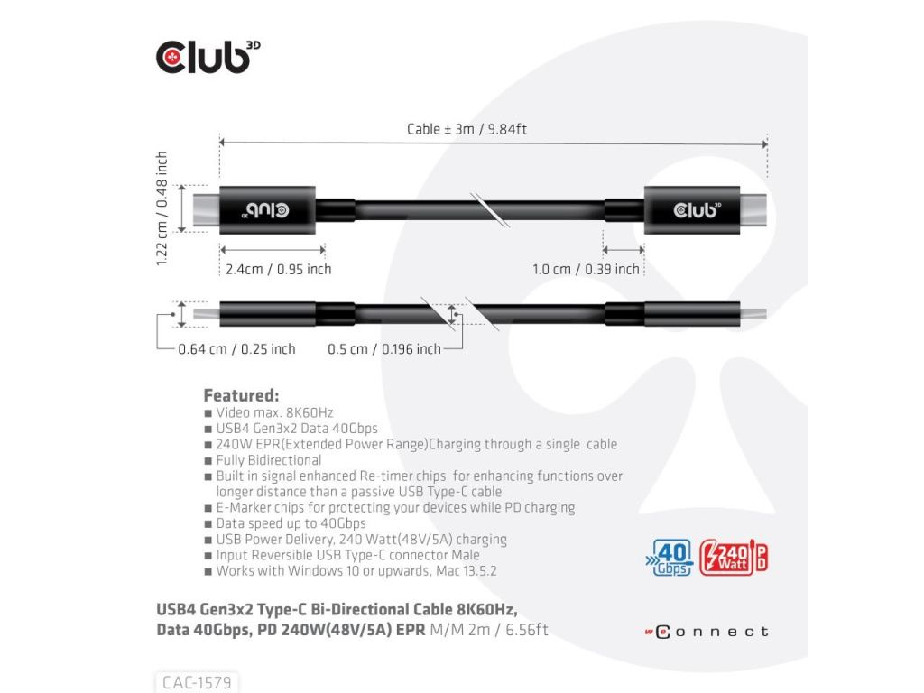 Obousměrný kabel Club 3D CAC-1579 USB4 Gen3x2 Type-C 8K60Hz nebo 4K120Hz, Data 40Gbps, PD 240W(48V/5A) EPR M/M 3m / 9,84ft propojí váš notebook, tablet nebo telefon s výstupem USB4 Type-C k vašim oblíbeným stávajícím periferním zařízením, příslušenství a nabíječkám. Umožňuje video, data a napájení přes jediný kabel a oběma způsoby. Vestavěné čipy Re-timer s vylepšeným signálem pro vylepšení funkcí na delší vzdálenost než pasivní kabel USB Type-C, spolu s čipy E-marker na obou koncích kabelu poskytují tomuto kabelu podporu pro USB4 Gen3x2 Type-C Bi -Směrové video 8K60Hz nebo 4K120Hz, Data 40Gbps, PD 240W (48V/5A) EPR M/M na délku 3 m / 9,84 stop pro nabíjení nebo napájení vašeho notebooku, tabletu nebo smartphonu.