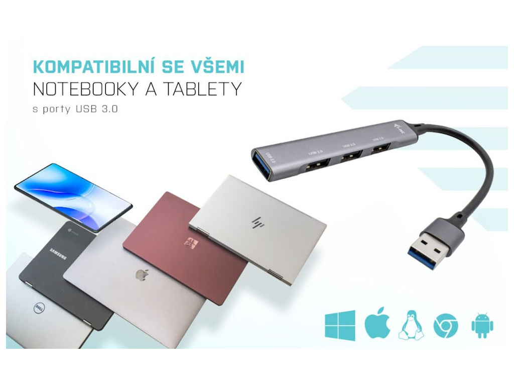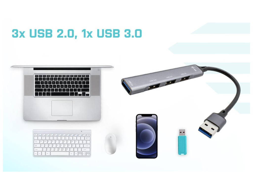 I-TEC USB 3.0 HUB MetalS tímto hubem získáte další jeden USB 3.0 a tři USB 2.0 porty. Připojte si externí klávesnici a myš, přenášejte data nebo filmy z USB flash disku rychlostí až 5 Gbps nebo nabíjejte svá mobilní zařízení. Hub nevyžaduje instalaci ovladačů, pouze jej pomocí USB kabelu připojíte a můžete jej ihned začít využívat.