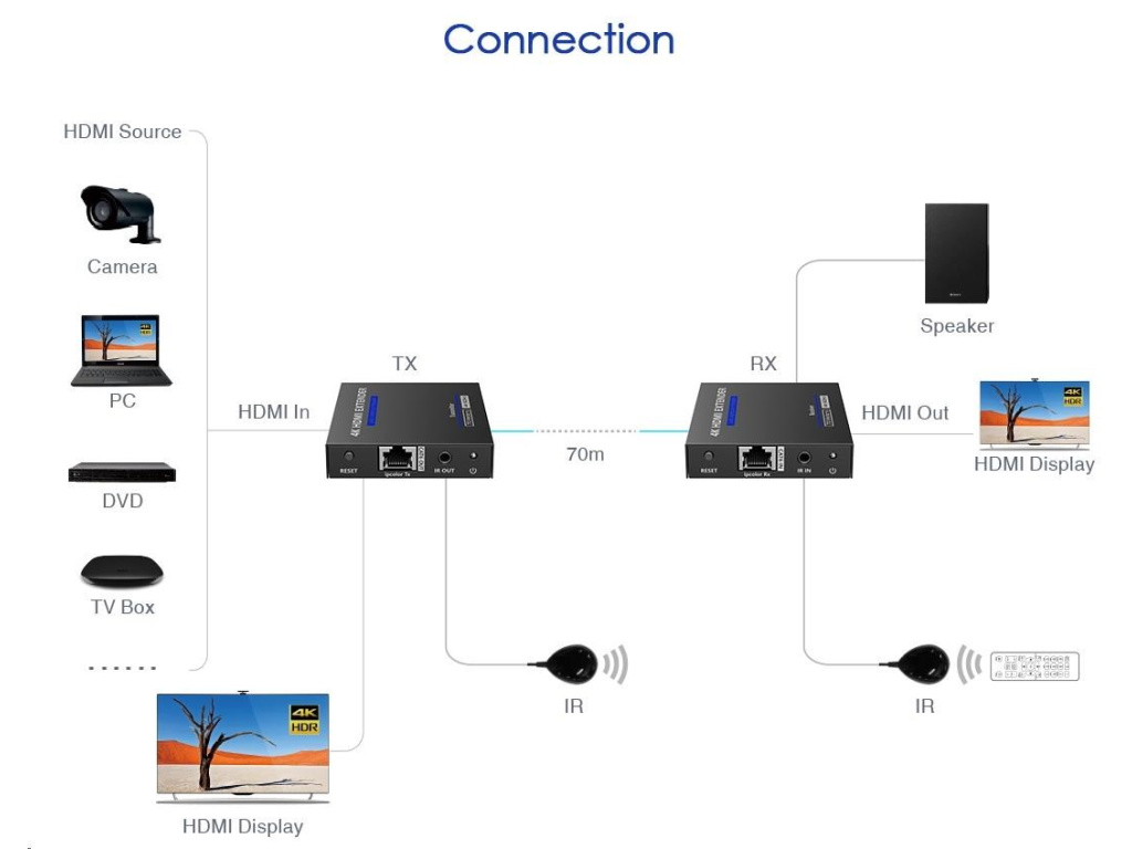 - HDMI signál lze přenášet až do 70m přes kabel Cat.6 / 6A / 7; až 40 m na kabelu Cat.5E