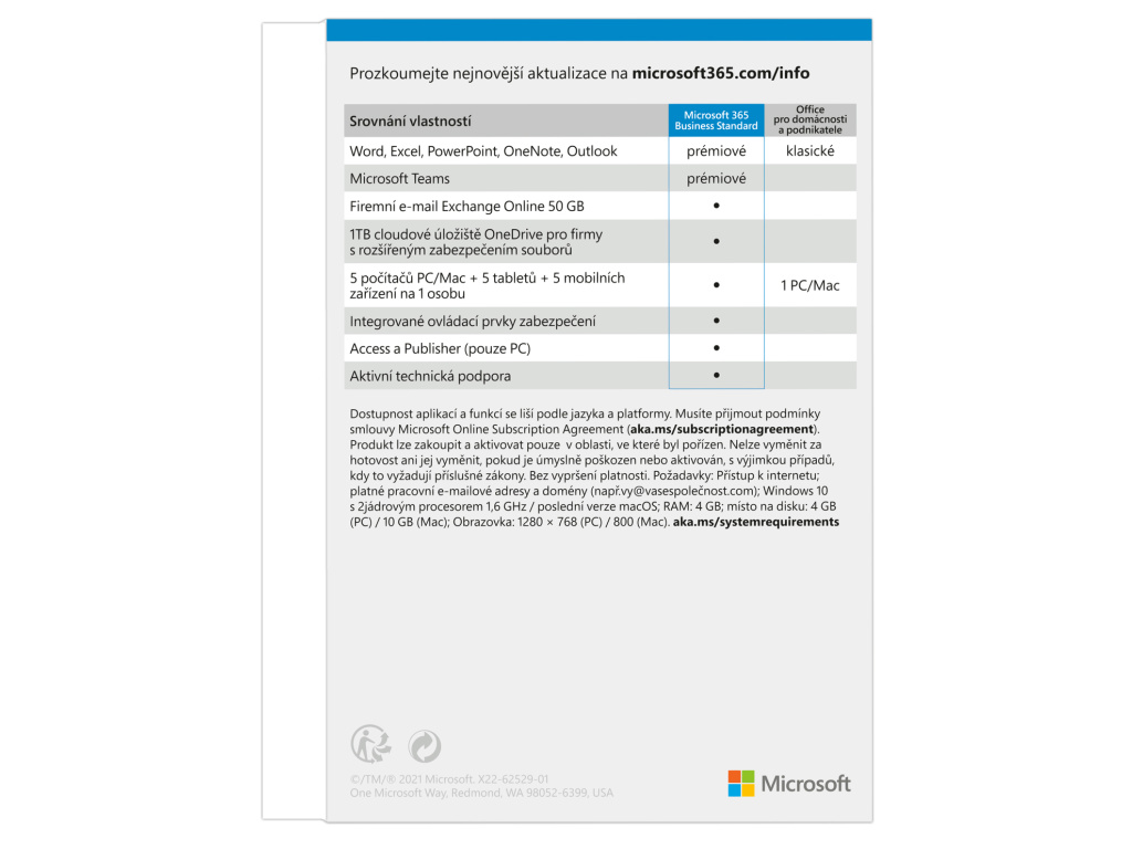 Obsah balíku Microsoft 365 Business Standard CZ (BOX)