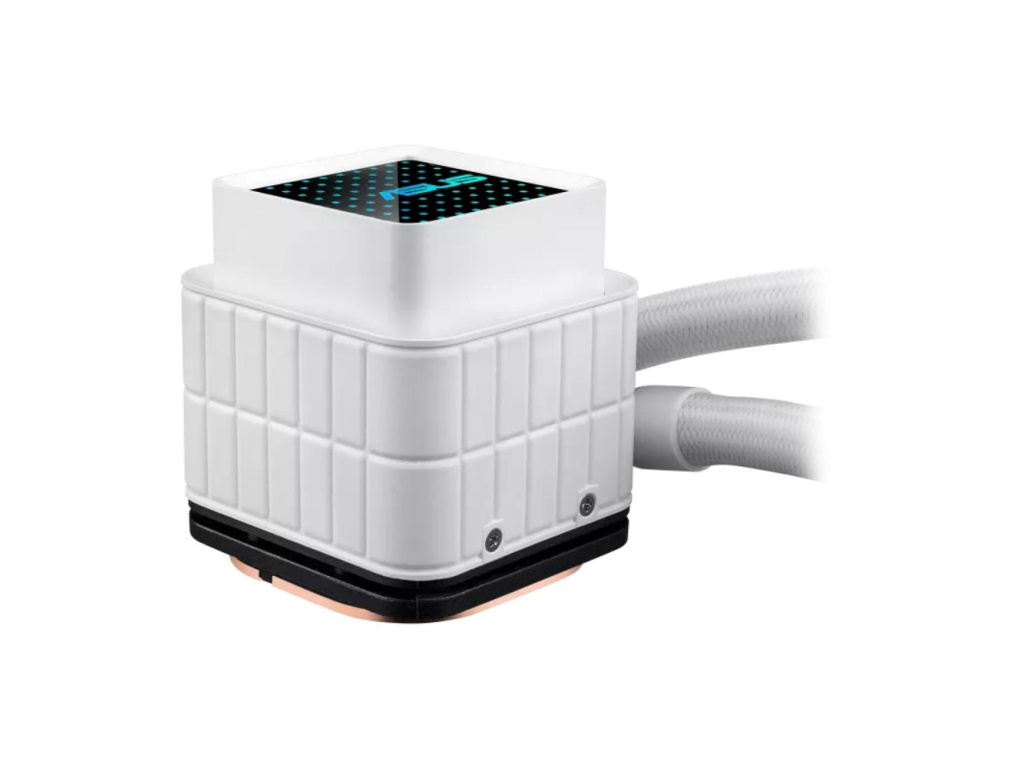 All-in-one vodní chladič procesoru Prime LC ARGB White Edition s velkou kontaktní plochou a žebrovanými kanály, vodním blokem s možností volby nekonečných zrcadlových čoček, integrovanými ventilátory ARGB a osvětlením Aura.