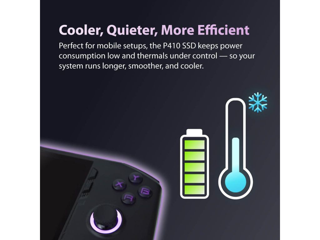 P410 SSD je vybaven vysoce účinným grafenovým chladičem a technologií tepelného řízení, které udržují systém v optimálních teplotách i při vysoké zátěži. Tím je zajištěn stabilní výkon a prodloužena životnost disku.