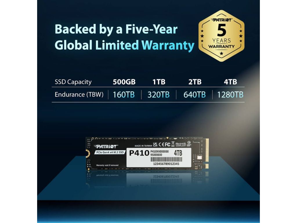Design s vysoce účinným tenkým grafenovým chladičem je navržen s ohledem na efektivní chlazení a celkově optimální tepelný management. Technologie SmartECC se postará o ochranu a integritu dat. Mezi další přednosti patří nízká spotřeba energie a méně produkovaného tepla. Také díky tomu je SSD jednotka Patriot P410 ideálním úložiště pro notebooky, případně další přenosná a kompaktní zařízení. Disponuje úložištěm 2 TB a představuje tak obří kapacitu pro ukládání filmů, videí, her, pracovních projektů nebo multimédií ve vysokém rozlišení.