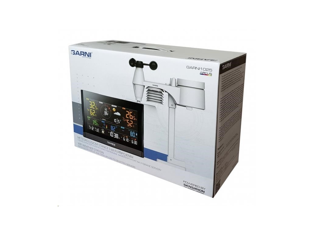 Wi-Fi meteorologická stanice model GARNI 1025 Arcus 2GEN s integrovaným bezdrátovým čidlem 7-v-1, která je vybavena mnoha funkcemi shromažďuje přesné a podrobné údaje o počasí. Integrované bezdrátové čidlo pracuje na frekvenci 868 MHz a měří vnější teplotu a relativní vlhkost, rychlost a směr větru, dešťové srážky, barometrický tlak, UV index a intenzitu slunečního záření. Výrobek používá vysoce přesná švýcarská čidla SENSIRION a umožňuje kalibraci některých meteorologických veličin.