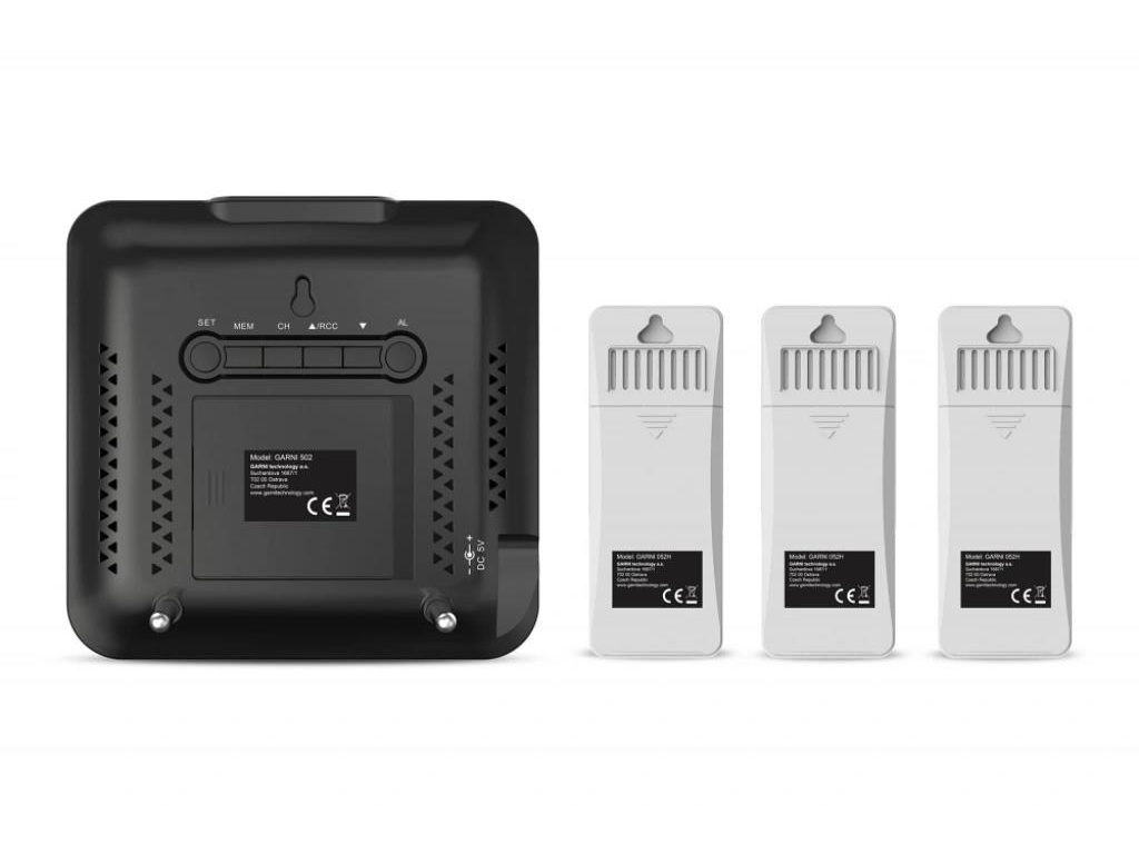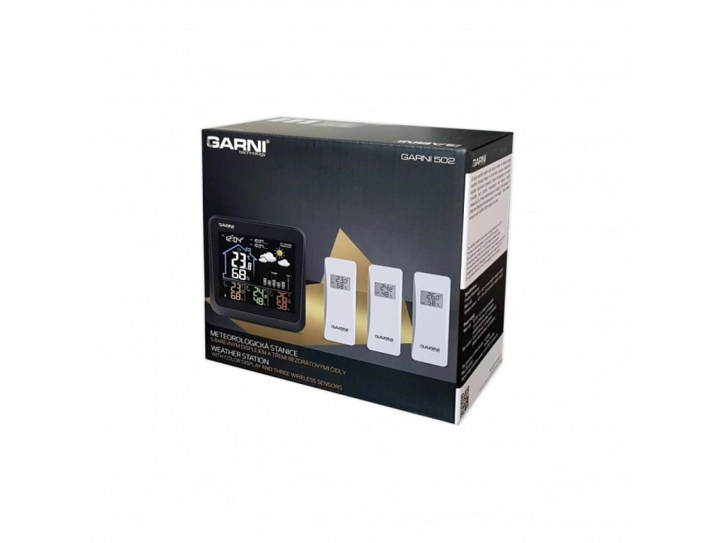Meteorologická stanice se 3 bezdrátovými čidly pro měření vnější teploty a relativní vlhkosti, špičkovým inverzním barevným VA displejem s časem a datem řízenými rádiovým signálem DCF-77, budíkem, grafem, měřením vnitřní teploty, relativní vlhkosti a absolutního a relativního barometrického tlaku. Zobrazení všech měřených hodnot na displeji současně. špičkový inverzní barevný VA displej o rozměrech 106 x 94 mm s možností stálého osvětlení při napájení síťovým adaptérem, nebo krátkodobým osvětlením na 10 s při napájení bateriemi tři stupně jasu osvětlení displeje (při napájení síťovým adaptérem) a možnost vypnutí osvětlení displeje velikost číslic na displeji – čas, datum 7 mm, vnitřní teplota 21 mm, vnitřní relativní vlhkost 14 mm, vnější teplota 12,5 mm, vnější relativní vlhkost 10 mm, barometrický tlak 4,5 mm barvy na displeji: čas, barometrický tlak, vnitřní teplota a rel. vlhkost, graf bílá, teplota a rel. vlhkost na kanálu č.1 žlutá, na kanálu č.2 zelená a na kanálu č.3 oranžová čas a datum řízené signálem DCF-77 s možností manuálního nastavení ikona příjmu signálu DCF-77 12ti, nebo 24 hodinový formát zobrazení času možnost nastavení časového pásma od -12 do +12 hodin budík s funkcí opakovaného buzení (Snooze) po 5 minutách budící signál - 10 sekund 1 pípnutí za sekundu, 10 sekund 2 pípnutí za sekundu, 10 sekund 4 pípnutí za sekundu a poté stálé pípání 5 ikon předpovědi počasí (jasno, polojasno, oblačno, srážky (déšť), srážky (sněžení) na základě sledování barometrického tlaku vestavěným barometrickým čidlem možnost nastavení výchozí ikony předpovědi počasí zobrazení hodnot vnitřní a vnější teploty a relativní vlhkosti ze všech 3 čidel současně zobrazení teploty ve °C, nebo °F zobrazení barometrického tlaku absolutního a relativního (hPa/mb nebo mmHg) možnost nastavení hodnoty relativního barometrického tlaku graf vývoje bar. tlaku, vnitřní a vnější teploty na všech třech kanálech za uplynulých 12 hodin paměť na maximální a minimální naměřené hodnoty teploty a rel. vlhkosti 3 ikony vnitřní tepelné pohody 3 bezdrátová čidla GARNI 052H jsou součástí balení bezdrátový přenos hodnot vnější teploty relativní vlhkosti na frekvenci 433 MHz ikona slabých baterií hlavní jednotky a venkovních čidel napájení hlavní jednotky síťovým adaptérem nebo bateriemi délka kabelu síťového adaptéru 1,80 m možnost postavení, nebo zavěšení barva černá Bezdrátové čidlo GARNI 052H vlhkosti odolné displej o rozměrech 25 x 12 mm velikost číslic na displeji: teplota 7 mm a relativní vlhkost 6 mm měření teploty a relativní vlhkosti 3 kanály maximální RF výkon 10 dBm (10 mW) možnost postavení, nebo zavěšení barva bílá Obsah balení: 1 x hlavní jednotka GARNI 502 3 x bezdrátové čidlo GARNI 052H 1 x síťový adaptér český, slovenský, německý, anglický, polský, maďarský a nizozemský návodEAN: 8592733021046