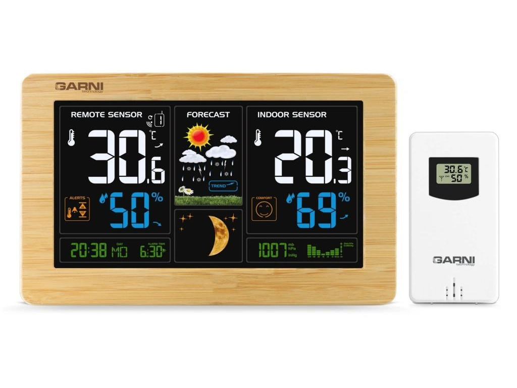 ? inverzní barevný VA displej o rozměrech 167 x 93 mm s možností stálého osvětlení při napájení síťovým adaptérem, nebo krátkodobým osvětlením na 15 s při napájení bateriemi ? ? velikost číslic na displeji – čas, datum, barometrický tlak 8 mm, zkratka názvu dne 6 mm, vnitřní a vnější teplota 30 mm, vnitřní a vnější relativní vlhkost 20 mm ? čas a datum řízené signálem DCF-77 s možností manuálního nastavení ? ikona příjmu signálu DCF-77 ? zkratka názvu dne ? 12ti, nebo 24 hodinový formát zobrazení času ? možnost nastavení časového pásma od -12 do +12 hodin ? ? budící signál - 10 sekund 1 pípnutí za sekundu, 10 sekund 2 pípnutí za sekundu, 10 sekund 4 pípnutí za sekundu a poté stále 8 pípnutí za sekundu ? 6 animovaných ikon předpovědi počasí (slunečno, polojasno, oblačno, srážky, silný déšť a sněžení) na základě sledování barometrického tlaku vestavěným barometrickým čidlem ? ? ? měření absolutního barometrického tlaku (mb / hPa nebo inHg) ? šipky tendence vývoje absolutního barometrického tlaku, vnitřní a vnější teploty a rel. vlhkosti ? ? zobrazení teploty ve C, nebo F ? možnost použití až 3 bezdrátových čidel GARNI 30H (jedno čidlo GARNI 030H je součástí dodávky) ? funkce automatického přepínání kanálů ? 5 ikon vnitřní tepelné pohody ? bezdrátový přenos hodnot vnější teploty a relativní vlhkosti na frekvenci 433 MHz ? ikona příjmu signálu bezdrátového čidla ? zobrazení fáze Měsíce ? USB port pro nabíjení mobilních zařízení (pouze při napájení hlavní jednotky síťovým adaptérem), maximální nabíjecí proud 1 000 mA ? ikony slabých baterií ? napájení síťovým adaptérem nebo bateriemi ? možnost postavení, nebo zavěšení ? barva bílá, přední rámeček z bambusového dřeva Bezdrátové čidlo GARNI 030H ? vlhkosti odolné ? displej o rozměrech 19 x 11 mm ? velikost číslic na displeji: teplota a relativní vlhkost 4 mm ? měření teploty a relativní vlhkosti ? 3 kanály ? maximální RF výkon 10 dBm (10 mW) ? možnost postavení a zavěšení ? barva bílá Obsah balení: 1 x hlavní jednotka GARNI 547 Line 1 x bezdrátové čidlo GARNI 030H 1 x síťový adaptér český, slovenský, německý, anglický, nizozemský, polský a maďarský návodEAN: 8592733021091
