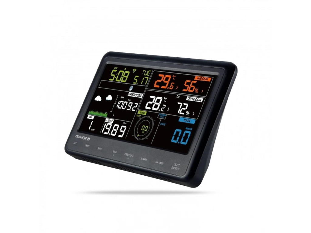 Hlavní jednotka má snadno čitelný barevný inverzní displej, který zobrazuje předpověď počasí, vnitřní a venkovní teplotu a relativní vlhkost, hodnotu barometrického tlaku, srážek, rychlost a směr větru, UV index, hodnotu intenzity osvětlení, čas a datum, hodnotu rosného bodu, Wind Chill a teplotního indexu.