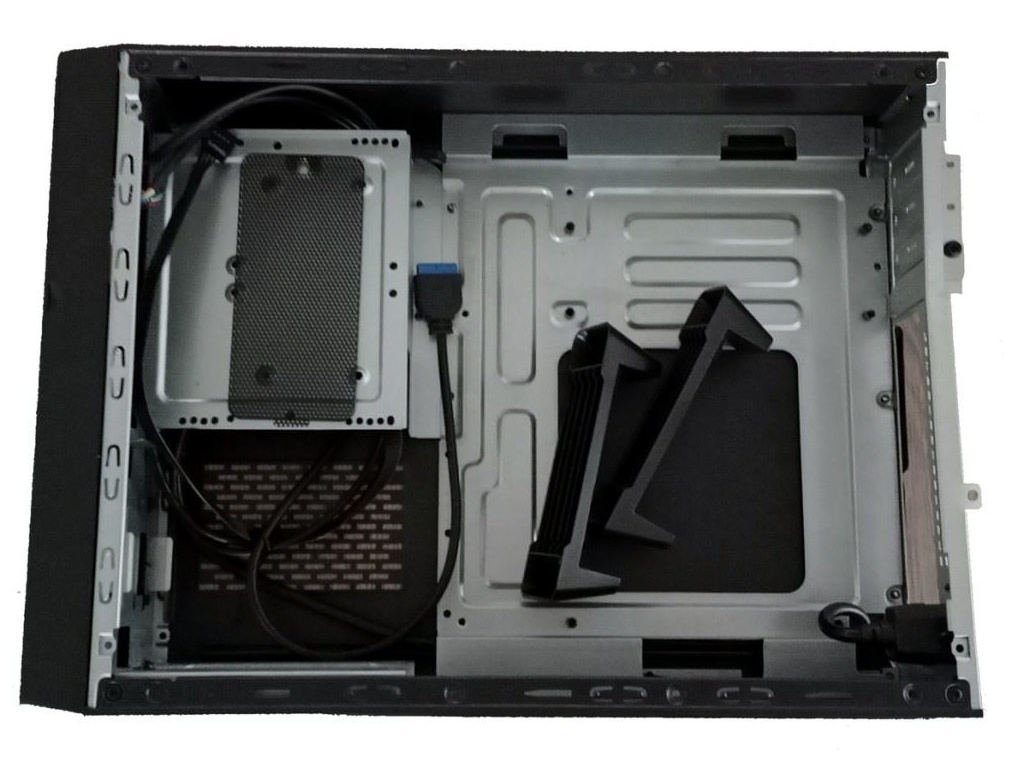 Pro osazení můžete využít 3.5“ a 2.5“ slot pro HDD a SDD. Interiér se chlubí povrchovou úpravou třídy A SPCC o vydatnosti vrstvy 0.4 mm. Tato skříň je primárně určena pro základní desky formátu M-ATX/mini ITX.
