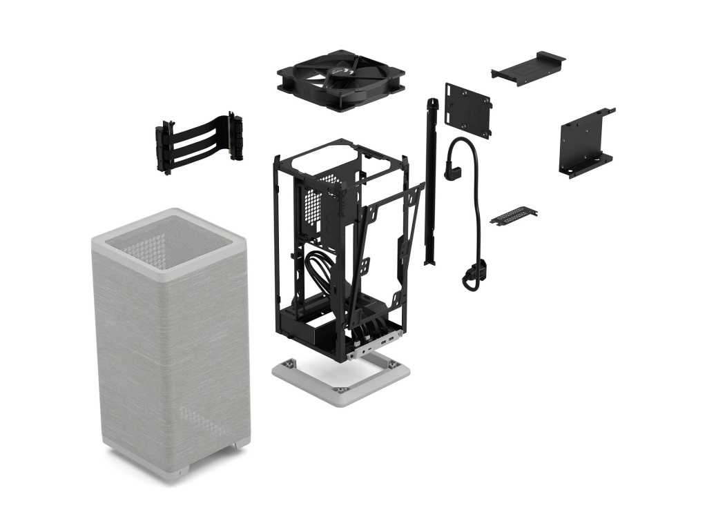 Fractal Mood • snadno dostupné - vysuňte zadní panel a jednoduše sejměte kryt potažený látkou, abyste získali úplný přístup ke své konstrukci • vyrobeno z prodyšné látky • efektivní chlazení s přiloženým 180mm dynamickým ventilátorem