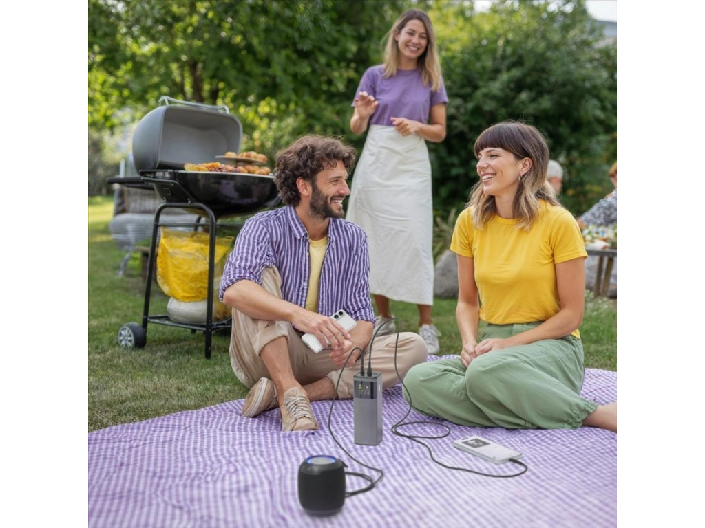 Powerbanka má celkový výstupní výkon max. 200 W. Připojíte-li dvě zařízení k oběma USB-C zásuvkám, výkon každé zásuvky bude 100 W. Připojíte-li zařízení ke všem třem zásuvkám, výkon se rozdělí na 100 W pro jednu USB-C zásuvku, 65 W pro druhou USB-C a 18 W pro USB-A zásuvku.