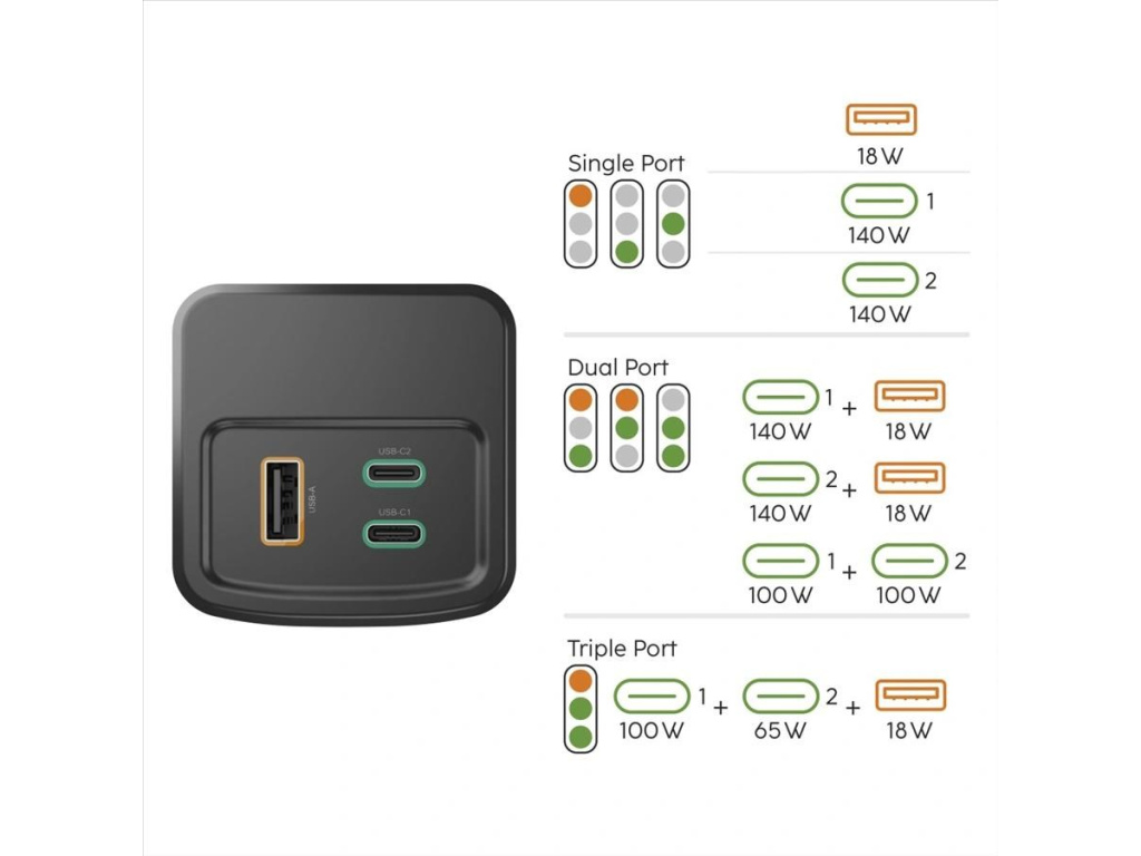 - možnost současného nabíjení 3 zařízení ze 2 USB-C zásuvek a 1 USB-A zásuvky
