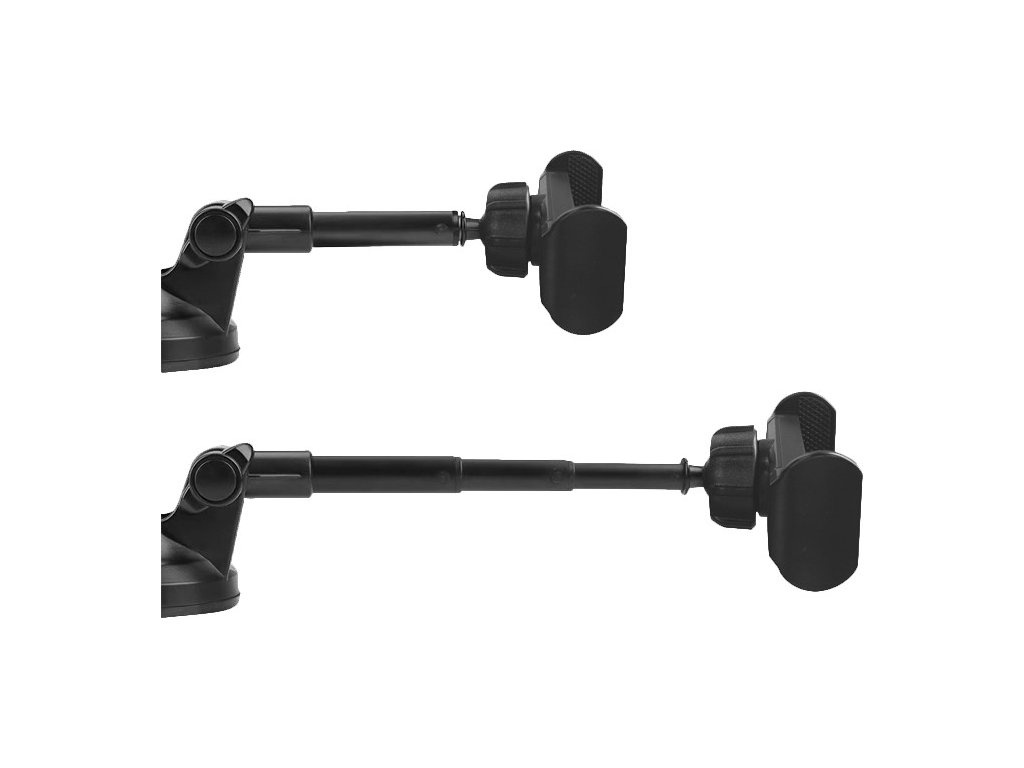 Univerzální držák v elegantním černém provedení je díky roztahovacím úchytům kompatibilní s každým zařízením s hloubkou 5,8 mm až 8,5 mm. Disponuje teleskopickou částí, která umožňuje polohování o 360 °. Instalace je možná na čelní sklo automobilu.EAN: 8591194107023