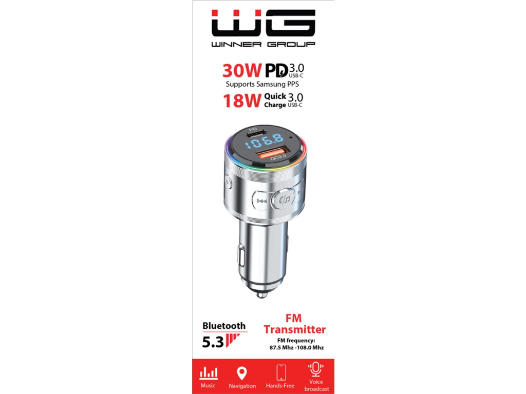 WG - Nabíječka do auta, Transmitter FM, USB-A QC 3.0 18W + USB-C PD 30W, stříbrná, 11753