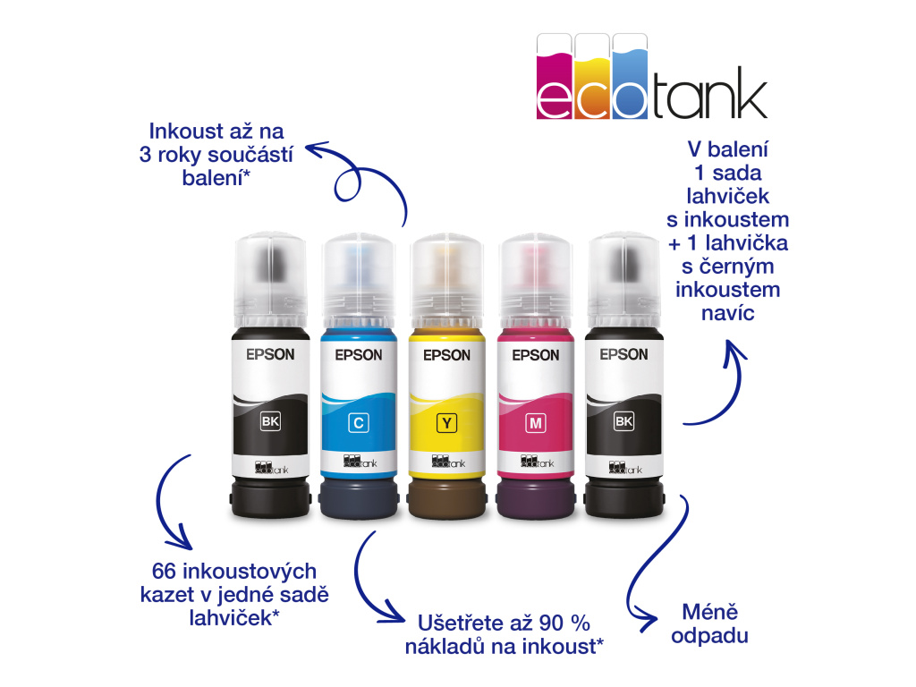 Obsah dodávky: 4 samostatné 65ml lahvičky s inkoustem (černá, azurová, žlutá a purpurová) a 1 náhradní lahvička s černým inkoustem, Hlavní zařízení, napájecí kabel, Návod k instalaci, Záruční dokument