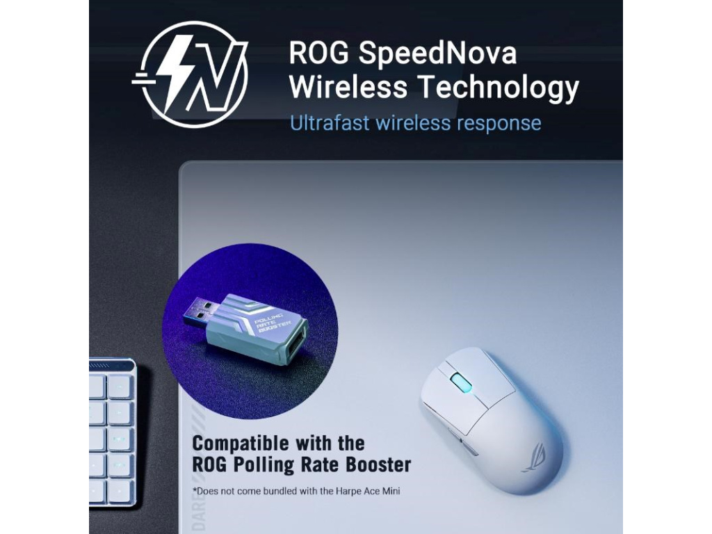 ROG Harpe Ace Mini je ultralehká 49gramová polosymetrická herní myš s tvarem schváleným profesionálními hráči FPS. ROG Harpe Ace Mini je vybaven optickým senzorem ROG AimPoint Pro s rozlišením 42 000 dpi a optickými mikropřepínači ROG a zobrazuje špičkový bezdrátový výkon s bezdrátovou technologií SpeedNova a podporuje až 8 000 Hz bezdrátovou rychlost dotazování (kompatibilní s ROG Polling Rate Booster).