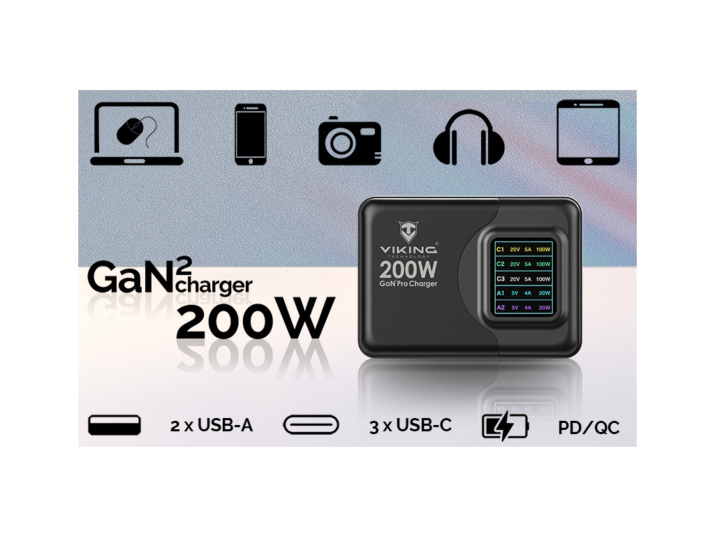 Budoucnost nabíjení je tady Viking USB GaN charger 200W PD Pro představuje budoucnost nabíjení. S podporou rychlého nabíjení až 200W budete mít vždy dostatek energie, ať jste kdekoli. Nechte vaše zařízení nabíjet s účinností, rychlostí a stylem, který si zasloužíte.