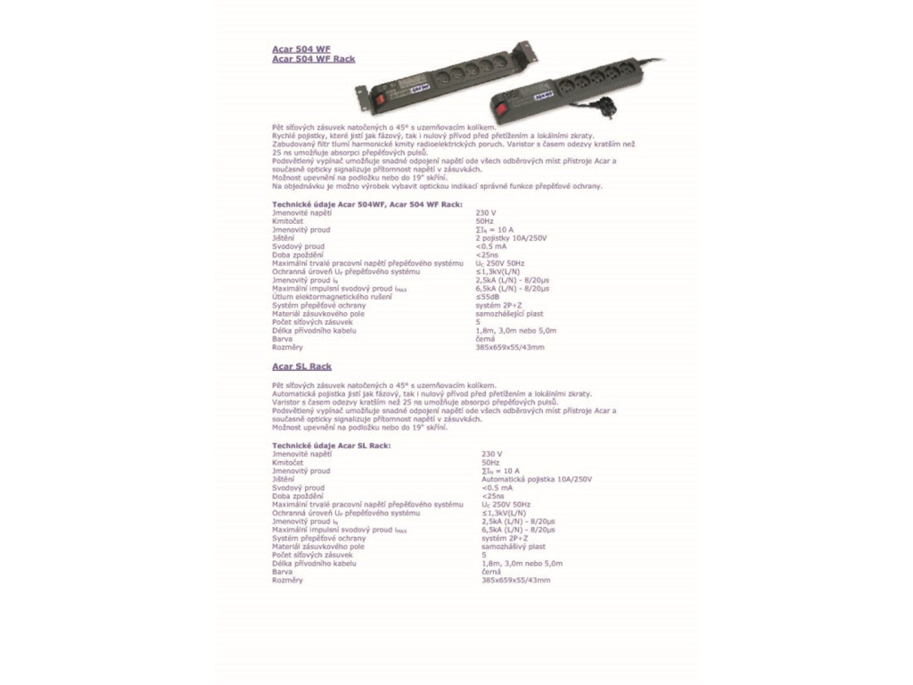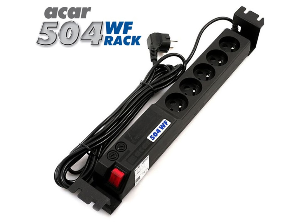 19''Speciální verze modelu acar 504WF určená do 19'' skříní. Skutečná ochrana před přepětím spolu s novým filtračním obvodem odstraňujím elektromagnetická rušení. Dokonale chrání počítače a audio video zařízení. Zařízení je dodáváno včetně montážních plíšků, kterými se dá modul připevnit do rackové skříně. - do racku - 2U - 5m - 5 zásuvek - černá barva PŘÍSTROJ MUSÍ BÝT PŘIPOJEN VÝHRADNĚ K ZÁSUVKÁM S OCHRANNÝM KOLÍKEM (UZEMŇUJÍCÍM)