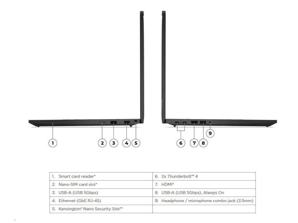 | Standartné porty | 1x USB-A (USB 5Gbps / USB 3.2 Gen 1) 1x USB-A (USB 5Gbps / USB 3.2 Gen 1), Always On 2x USB-C (Thunderbolt™ 4 / USB4 40Gbps), with PD 3.0 and DisplayPort™ 1.4 1x HDMI 2.1, up to 4K/60Hz 1x Headphone / microphone combo jack (3.5mm) 1x Ethernet (RJ-45) 1x Security keyhole |