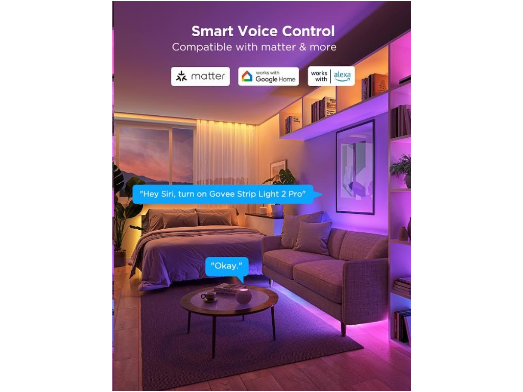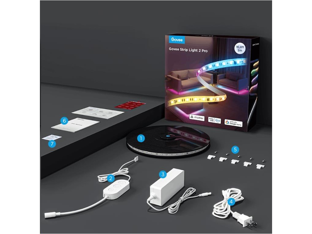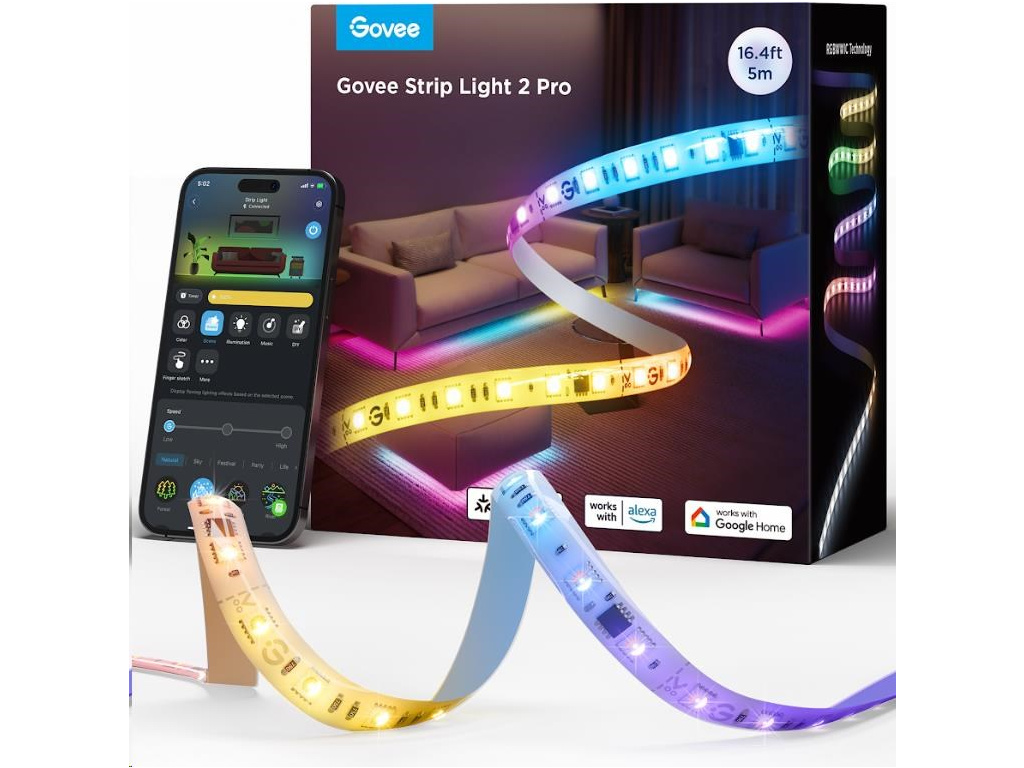 Govee LED Strip Light 2 Pro je vybaven in-house vyvinutým řídicím čipem G1151, který zajišťuje bezproblémovou a rychlou kontrolu světelných efektů. Diody RGBWWIC 5v1 poskytují perfektní reprodukci barev a dokonalé podání bílé barvy od teplé po studenou, hustota je 60 led na 1 metr. Pásek podporuje protokol Matter, což umožňuje bezproblémovou kompatibilitu s většinou Smart Home systémů s chytrými asistenty jako Google Assistant, Siri a Alexa, takže ji můžete snadno integrovat do své chytré domácnosti. Díky aplikaci Govee Home získáte plnou kontrolu nad barvami, jasem a segmenty LED pásky, přičemž je možné rozdělit pásku až na 6 segmentů na metr pro dokonalé barevné gradienty a personalizaci.