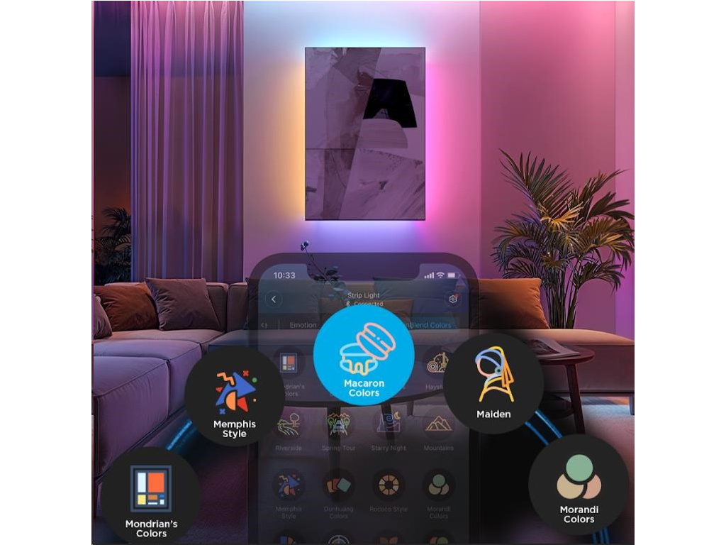 Pokročilý DIY režim LED Strip Light 2 Pro umožňuje vytvářet vlastní světelné efekty, zatímco desítky přednastavených scén vám poskytují okamžitou inspiraci pro různé příležitosti – od relaxačního večera po energickou párty. Každá scéna je navržena tak, aby maximálně využila možnosti plynulých přechodů barev a dynamických efektů. Se 16 miliony barev si můžete hrát s nekonečnými kombinacemi, které se dokonale přizpůsobí jakékoli atmosféře. Synchronizace s hudbou navíc zajišťuje, že světla oživí každý rytmus a zvýší zážitek z poslechu.