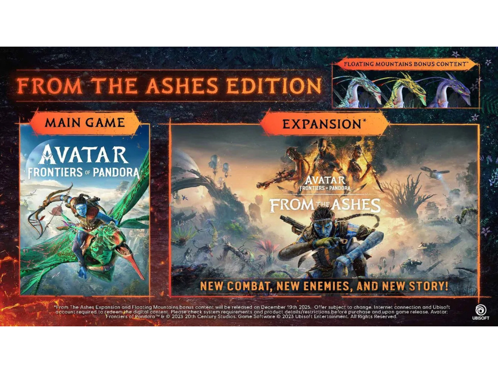 Avatar: Frontiers of Pandora From The Ashes Edition vám poskytne přístup k základní hře Avatar: Frontiers of Pandora a navíc získáte rozšíření From The Ashes. Ponořte se do nikdy neviděné Západní hranice Pandory a zažijte epické a nepředvídatelné dobrodružství v otevřeném světě. Staňte se Na'vi, přizpůsobte si svou postavu, vytvářejte si vybavení a vylepšujte dovednosti i zbraně tak, aby dokonale odpovídaly vašemu jedinečnému hernímu stylu. Tato edice vám otevírá dveře k rozšíření From The Ashes, které je inspirováno filmemAvatar: Fire and Ash
