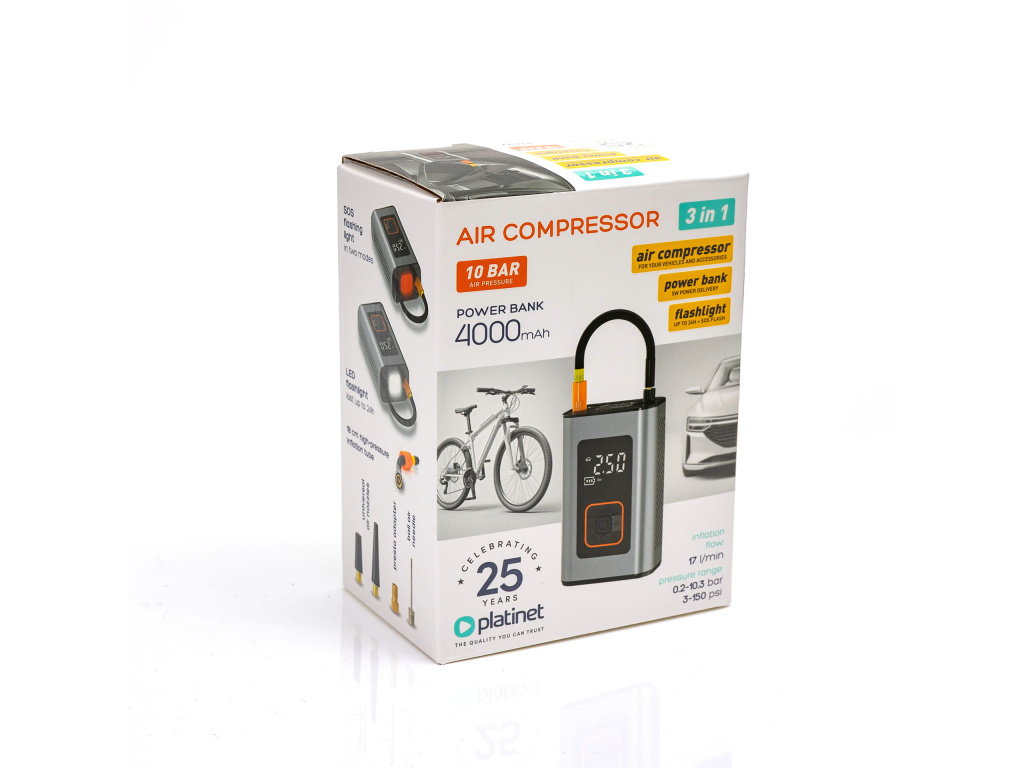 Platinet 3v1 Powerbanka 4000 mAh, digitální kapesní kompresor 10 BAR, LED svítilna, stříbrná, PLAPTC22