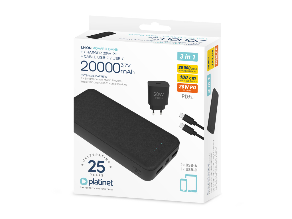 Platinet SET 3v1 Powerbanka 20000 mAh + Nabíječka 20W Power Delivery, kabel USB-C 1m, černá, PLAPMPB20SETB