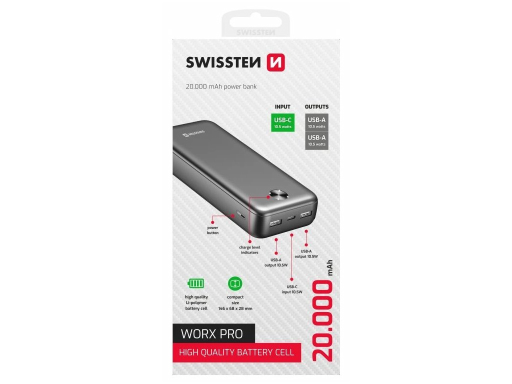 Powerbanka SWISSTEN WORX PRO disponuje kapacitou 20 000 mAh, díky čemuž je ideální pro opakované nabití smartphonu, tabletu, případně drobné nositelné elektroniky, jakou jsou fitness náramky, chytré hodinky, Bluetooth sluchátka apod. Navíc je vybavena dvojicí USB portů, a tak vám umožní nabíjení dvou zařízení najednou. Konstrukce je zhotovena z ohnivzdorného plastu, což zajišťuje odolnost a bezpečnost při manipulaci a častém používání.
