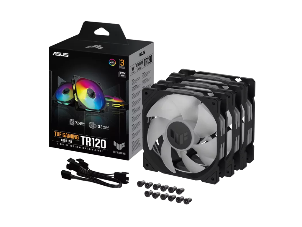 TUF Gaming TR120 ARGB Fan - Triple Pack Velikost ventilátoru: 120 x 120 x 28 mm Ložisko ventilátoru: Hydraulické Rychlost ventilátoru: 2000 RPM(+/- 10%) Airflow: 77.4 CFM Hluk ventilátoru: 29 dB(A) AURA SYNC
