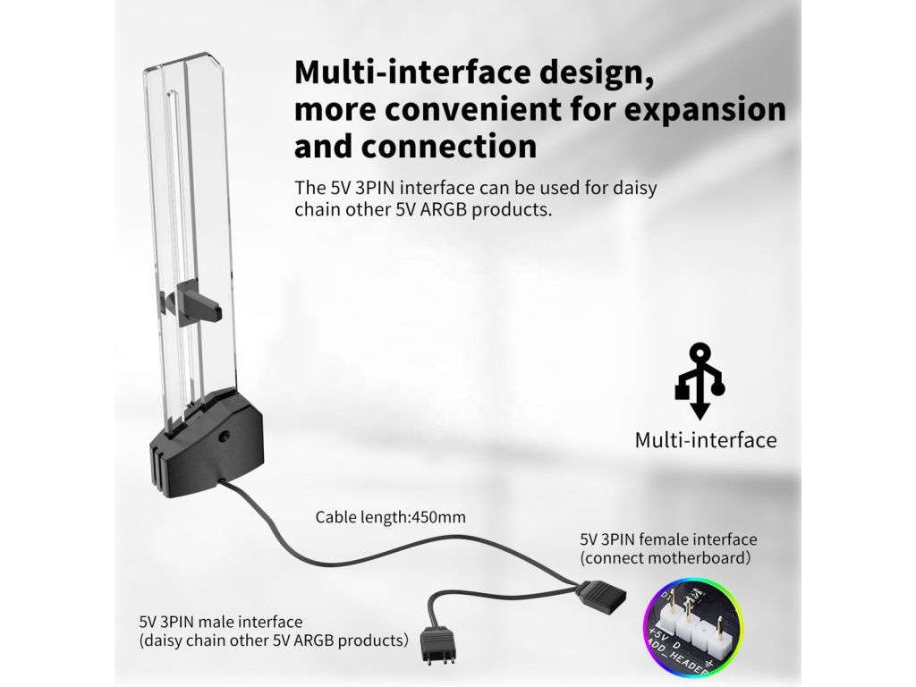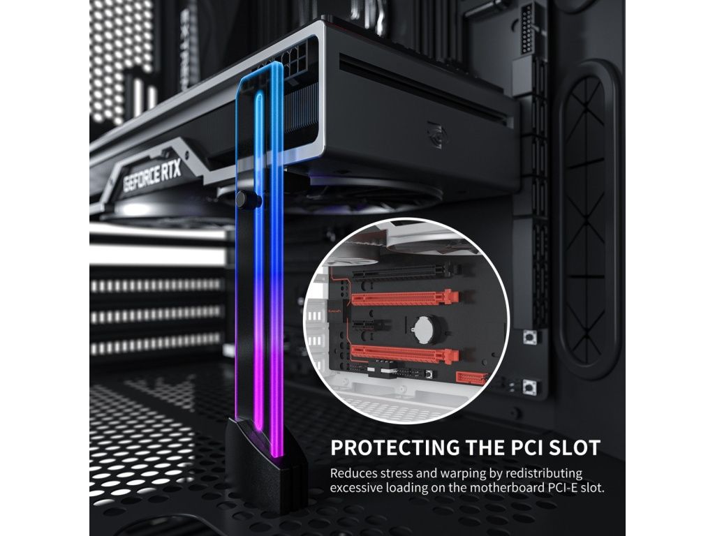Stylová varianta této opory Vaší grafické karty se sestává z hliníkové základny vybavené magnetem pro snadné uchycení do Vaší PC skříně a akrylátovým stojánkem se stavitelnou podpěrou a podsvícením LED aRGB. Zabraňuje tak prohýbání větších karet ve slotu a dodává sestavě lepší celkovou stabilitu. Toto řešení lze tak jednoduše posunout jak horizontálně tak i vertikálně a umožňuje instalaci v různých místech karty, pro maximální kompatibilitu s většinou karet. Rozměry držáku jsou 200 x 40 x 50mm.