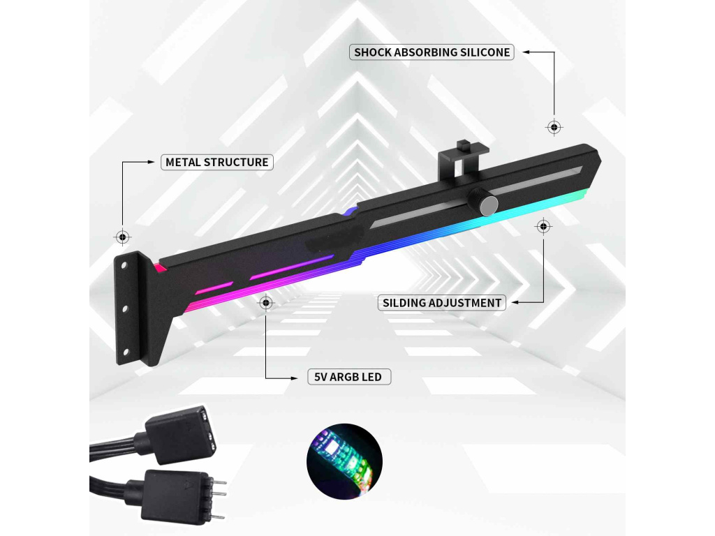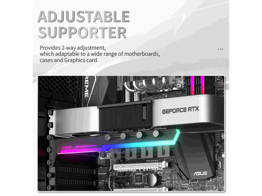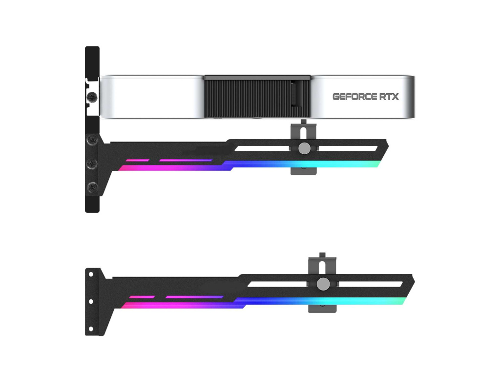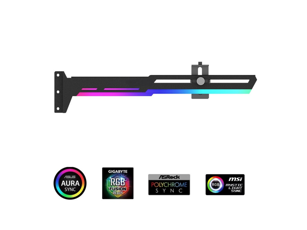 Stylová varianta této opory Vaší grafické karty je vyrobena z ocelového práškově lakovaného plechu a plastu, zabraňuje prohýbání větších karet ve slotu a dodává tak sestavě lepší celkovou stabilitu. Součástí je silikonová posuvná opora, kterou lze posunout jak horizontálně tak i vertikálně a umožňuje instalaci v různých místech karty, pro maximální kompatibilitu s většinou karet. Rozměry držáku jsou 280 x 52mm.