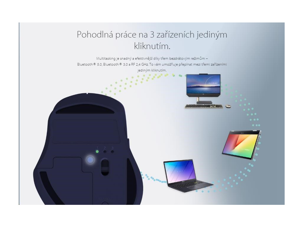 - Jedním kliknutím můžete pohodlně přepínat mezi třemi bezdrátovými zařízeními (Bluetooth® 5.0 / Bluetooth® 3.0 / RF 2,4 GHz).